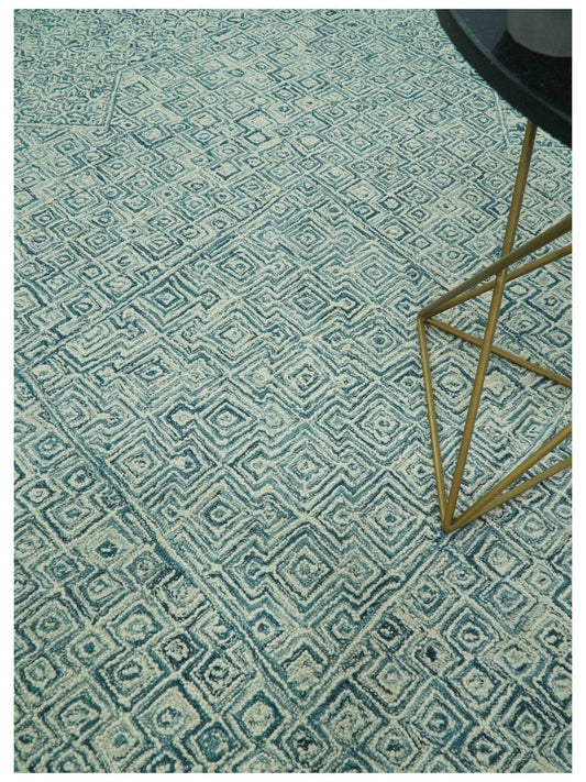 Modern Geometrical Teal and Ivory Hand Tufted Custom Made wool area rug