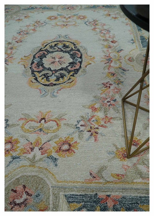French Design Aubusson Custom Made Ivory, Light Green and Charcoal Hand Tufted wool Area Rug