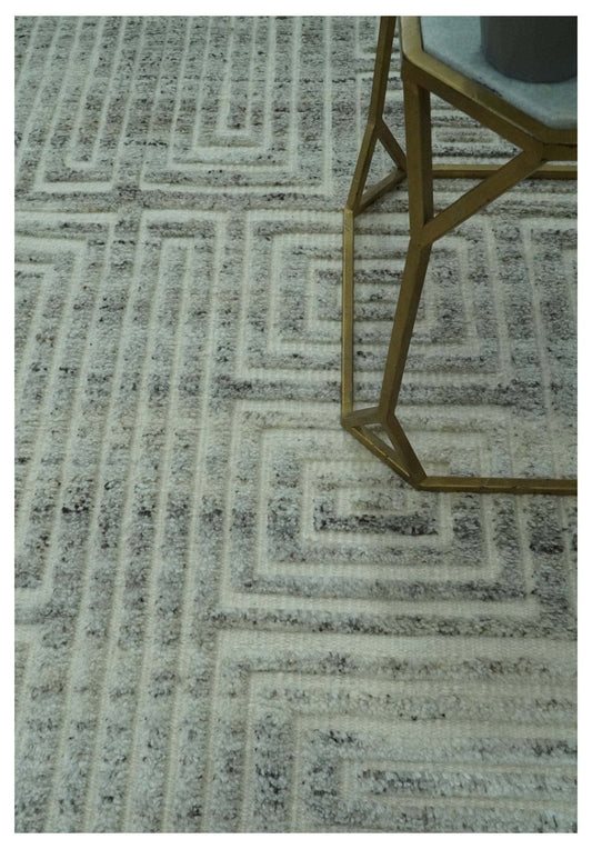 Ivory, Silver and Charcoal Modern Geometrical Puzzle Design hand knotted Custom Made wool Area Rug