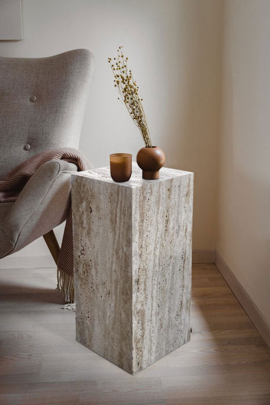 TCSC | Walnut Travertine Vein-cut Cube Design End/Side Table, Nightstand Polished (W)10" (L)10" (H)24"