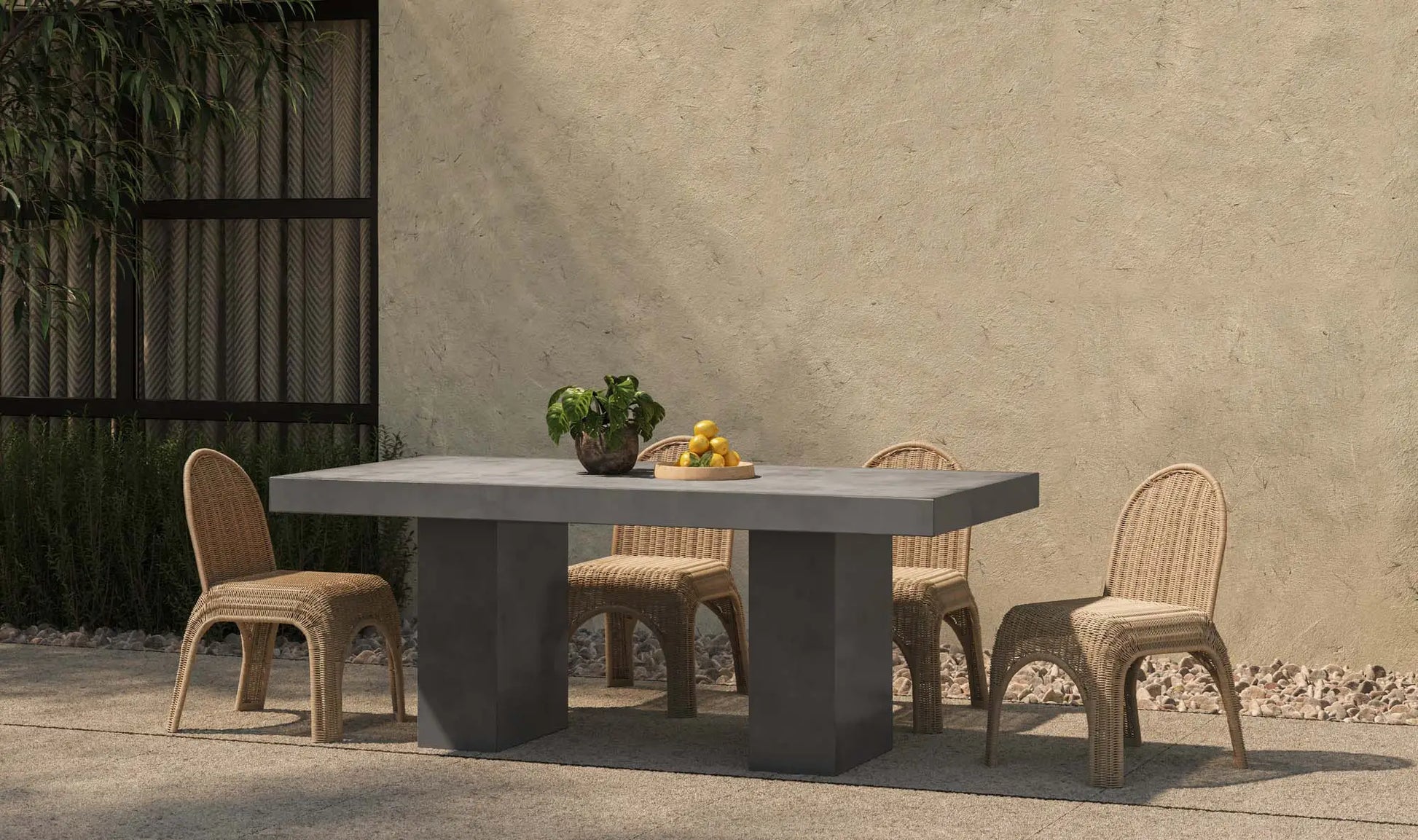 La mesa de comedor para exterior Antonius cuenta con un elegante diseño rectangular, sostenido por dos grandes patas tipo columna. Su construcción utiliza una mezcla única de hormigón y fibra, creando una pieza ligera y móvil con una estética moderna. Perfecta para cenar al aire libre, esta mesa tiene capacidad para seis personas y agrega un toque de lujo a cualquier espacio. Se requiere ensamblaje.