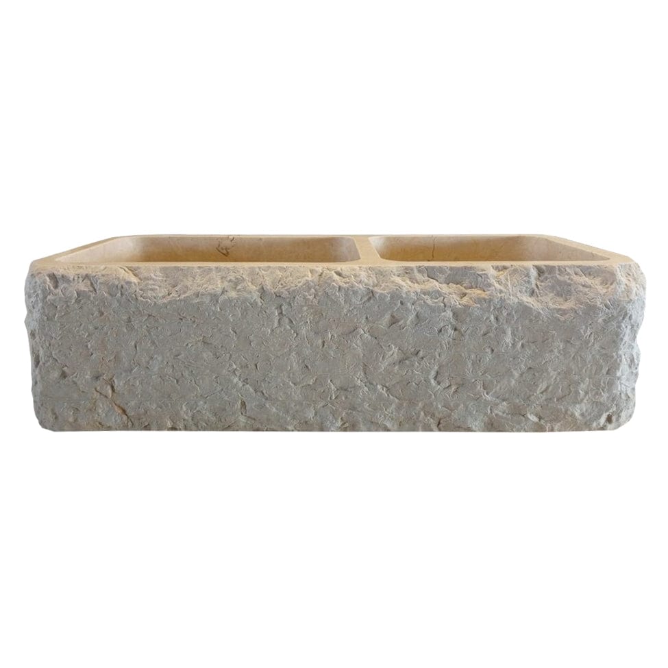 Hand-carved in Turkey from premium Botticino Beige Marble, this double-basin farmhouse sink brings timeless elegance and artisanal quality to the kitchen. Its polished interior highlights the natural beauty of the stone — warm beige tones with subtle veining — while the apron-front design layers texture and sophistication into your space.