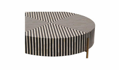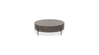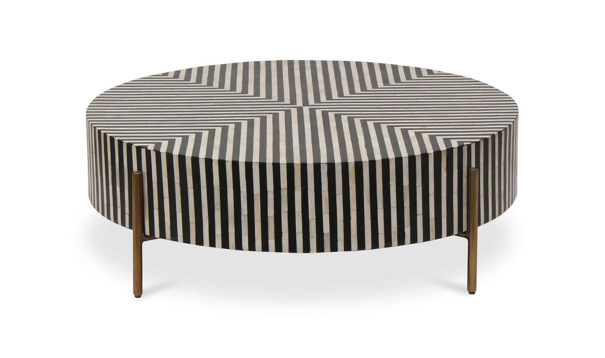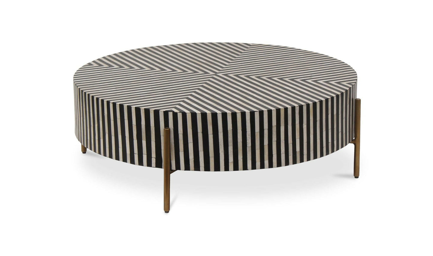 Simplistic and bold, the Chameau coffee table is an exercise in contrast, featuring a hypnotic art deco design. Simple construction and a delicate brass-finished base set off a veneer of white and black camel bone and resin, making a spellbinding visual statement. The Chameau series features a coffee table in three sizes and a side table perfect for any living space.
