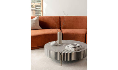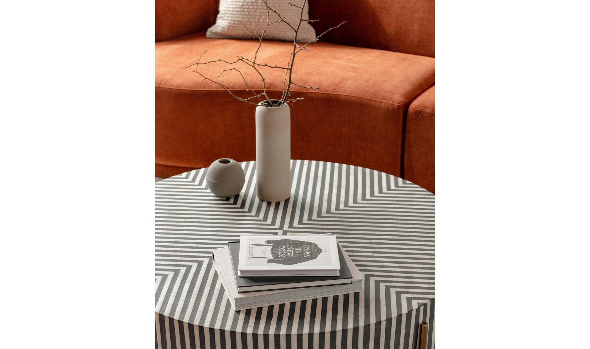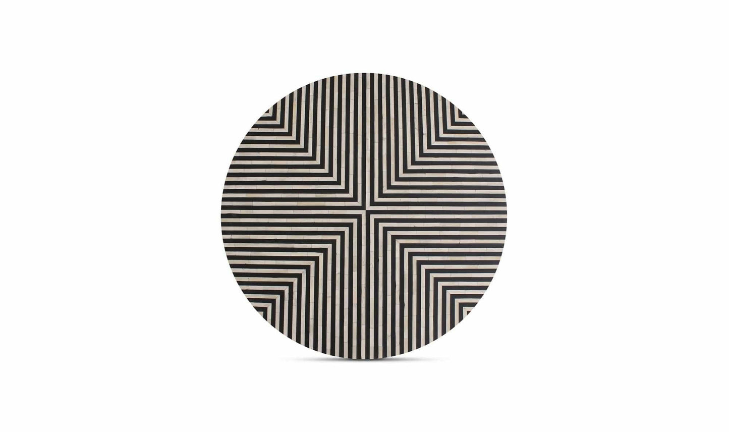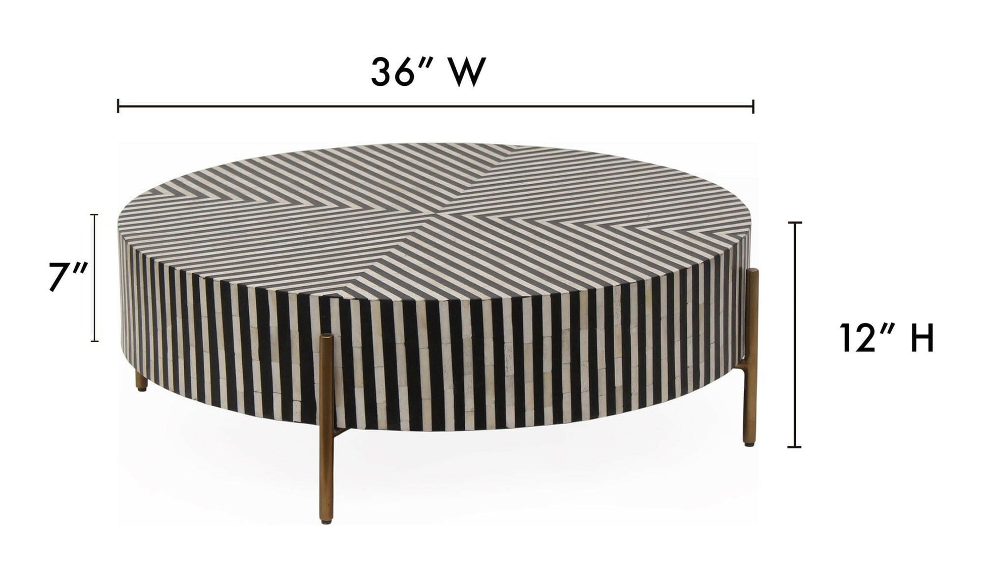 Simplistic and bold, the Chameau coffee table is an exercise in contrast, featuring a hypnotic art deco design. Simple construction and a delicate brass-finished base set off a veneer of white and black camel bone and resin, making a spellbinding visual statement. The Chameau series features a coffee table in three sizes and a side table perfect for any living space.