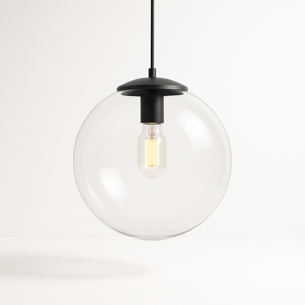 The Dysira Pendant Light features a sleek, spherical glass shade that diffuses soft, ambient light. Its minimalist design, suspended from a slim black cord, complements modern, contemporary, and Scandinavian interiors. This light fixture enhances dining areas, kitchen islands, and living spaces with its airy aesthetic while showcasing the bulb for an industrial touch. Ideal for residential and commercial settings, it adds a refined yet understated presence to any space.