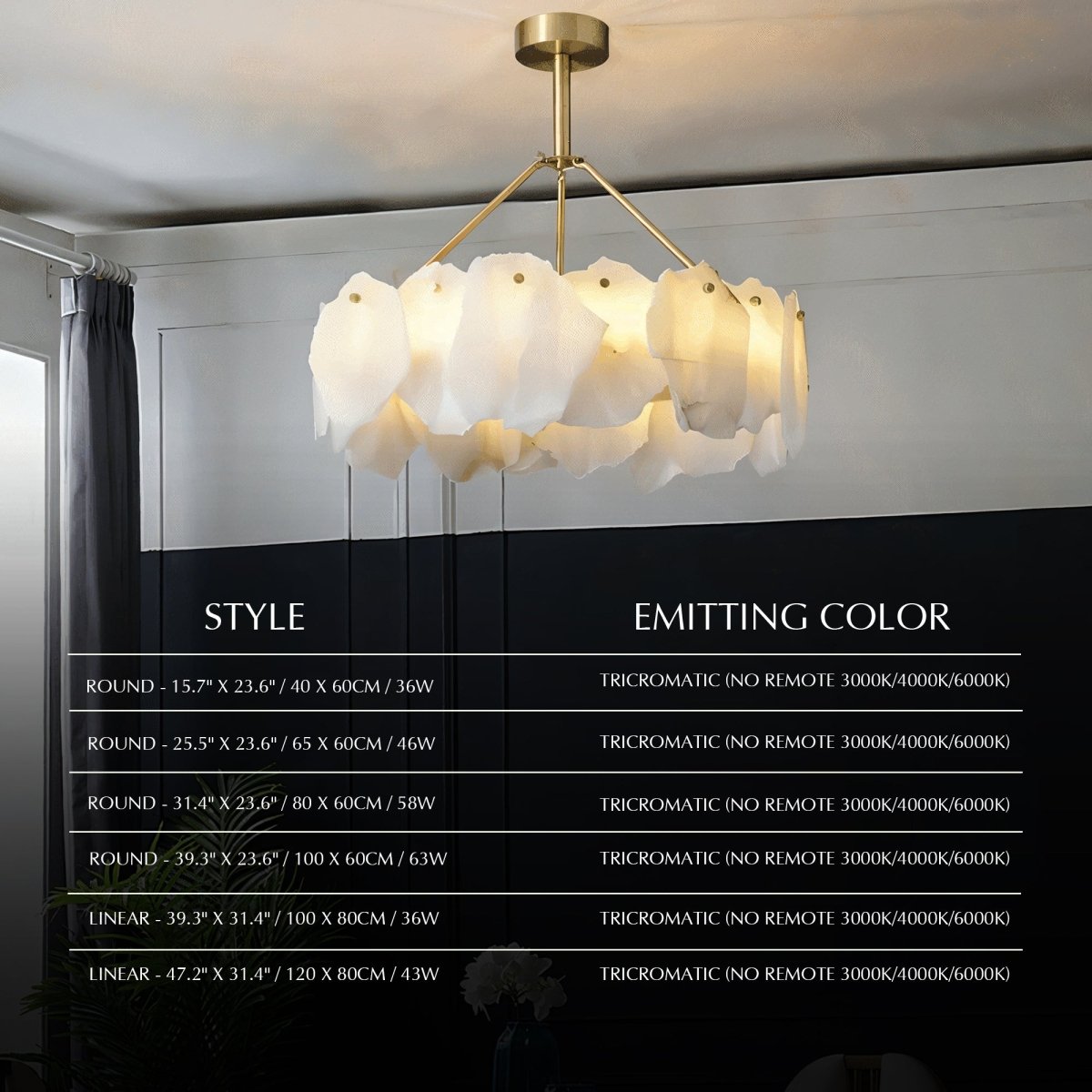 The Elora Chandelier is a striking modern light fixture crafted from copper and adorned with sculptural alabaster lampshades that diffuse light softly through irregularly contoured panels. Its design mimics the fluidity of petals or hand-torn parchment, offering an artistic and organic aesthetic. Available in both linear and round configurations, it suits installations above dining tables, in bedrooms, or in elegant lounge areas. The suspension structure uses sleek brass-toned rods, enhancing its luxurious visual appeal. Ideal for spaces seeking a blend of contemporary form and refined materiality.