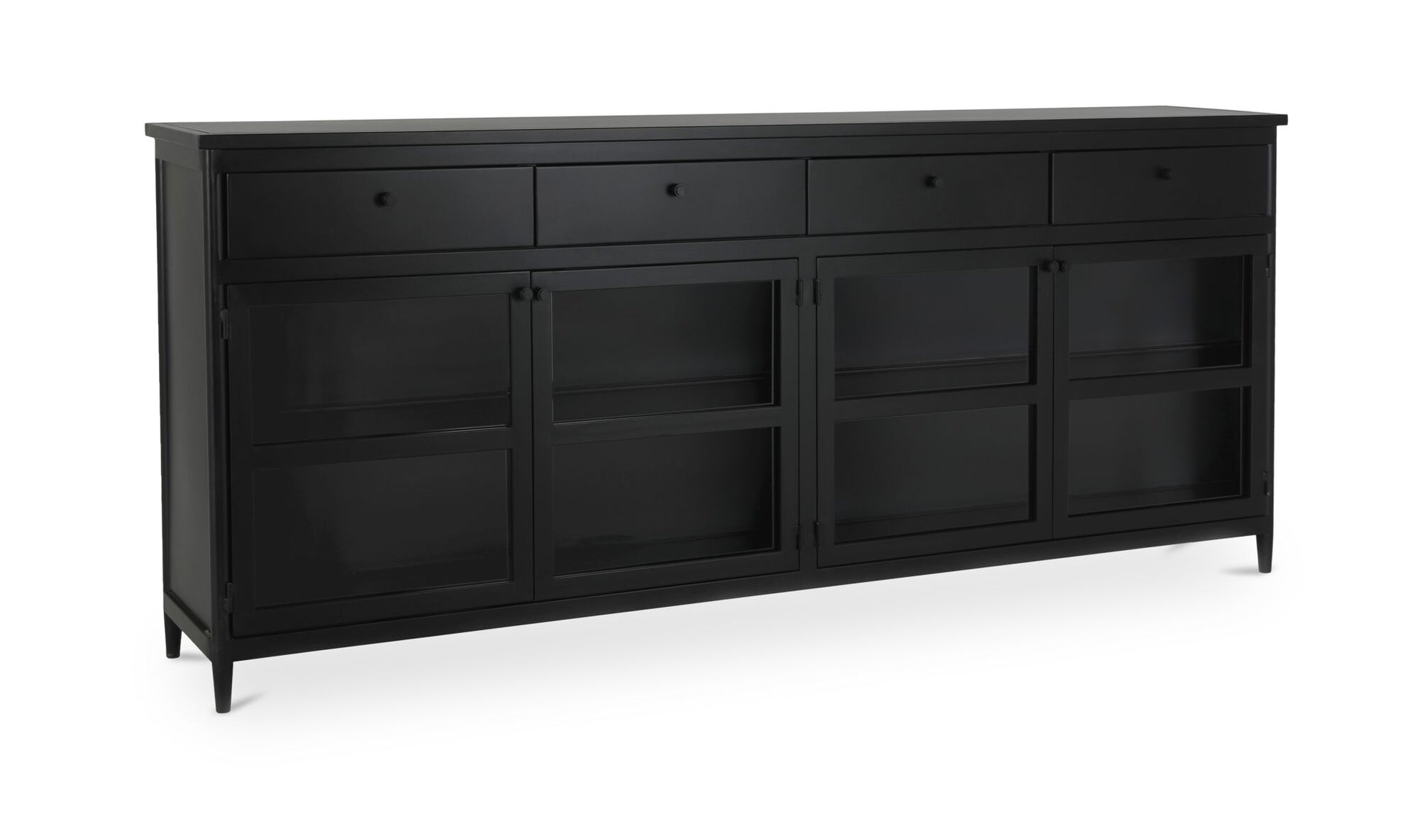 Built differently. The case for going full metal. Henry brings something different to the mix—full metal construction with a clean, transitional frame that adds texture and polish to any space. Four doors, half-glass and half-solid, offer a sleek way to show off what you love and stash what you don’t. Four doors, four drawers, and four shelves keep things tidy. Finished in matte black powder-coated steel, it’s a storage piece that keeps its cool—on display and behind the scenes.