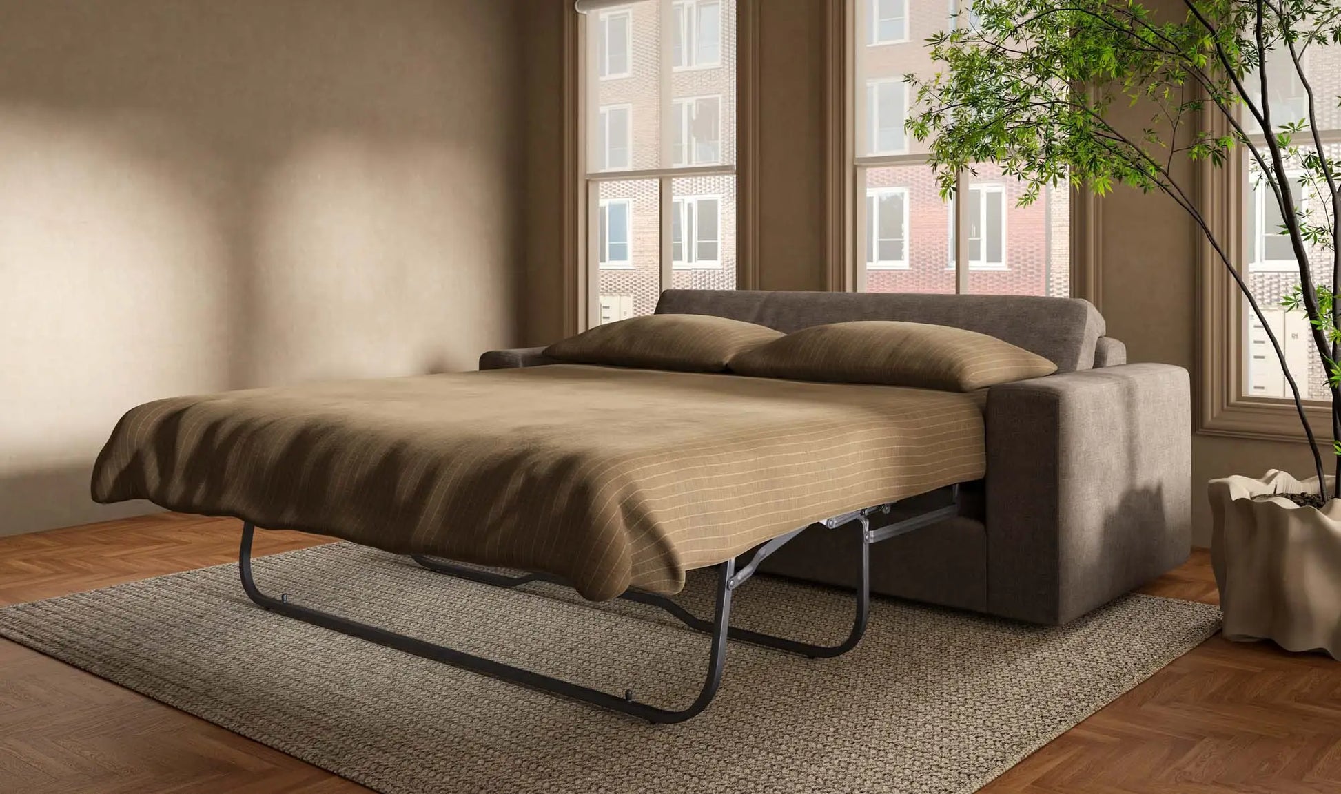 The Kiran sleeper sofa transcends conventional sleeper design, merging sleek, clean lines with the sumptuous touch of textured fabric upholstery. A short, queen-sized mattress is concealed within its elegant frame and is effortlessly revealed through a Leggett & Platt mechanism. Comfortably seating three, this piece speaks to versatile comfort and everyday beauty.