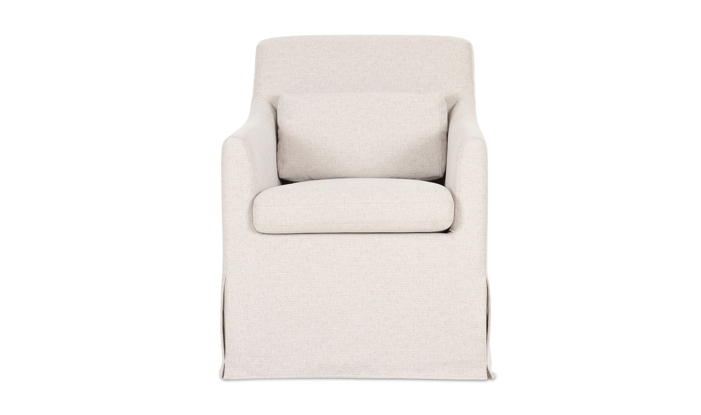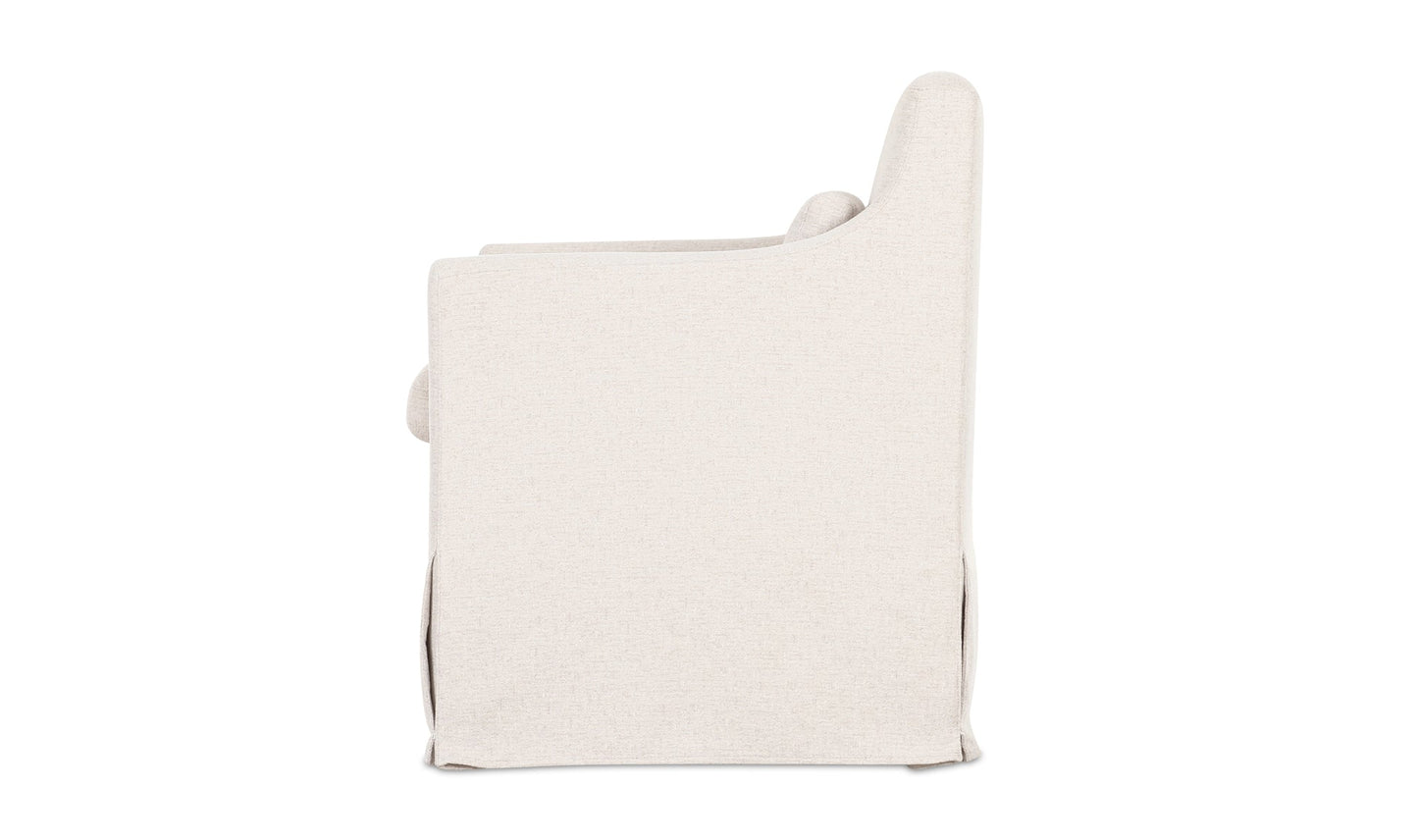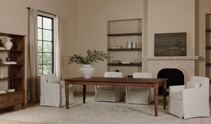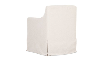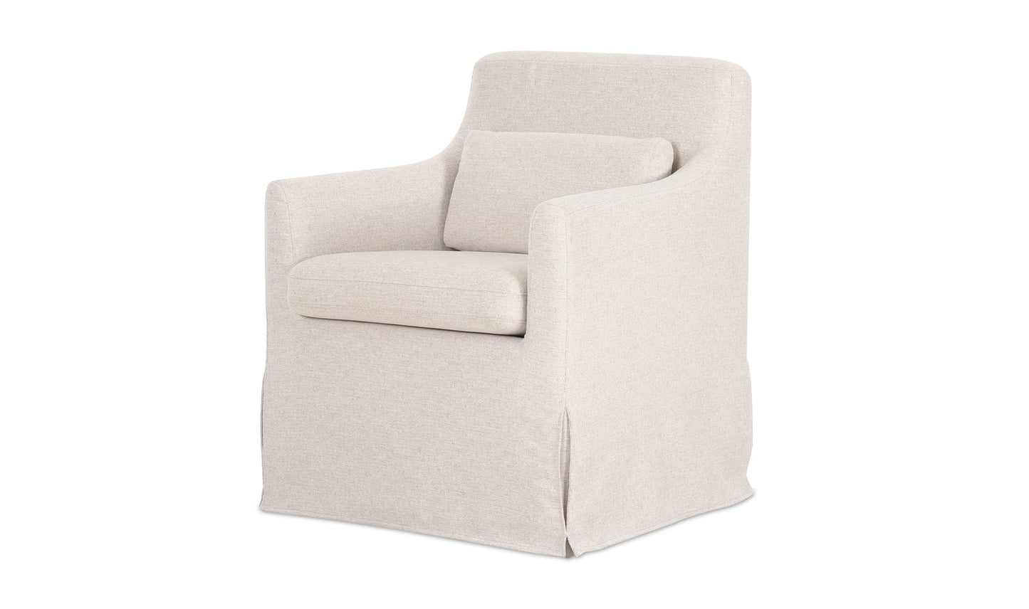 The Lydia slipcover dining chair speaks to traditional style, featuring curved armrests and a snug, neatly tailored slipcover with inverted pleats that is washable and easy to maintain. It includes a lumbar pillow for additional back support and comfort, while available rollers allow for functional convenience.