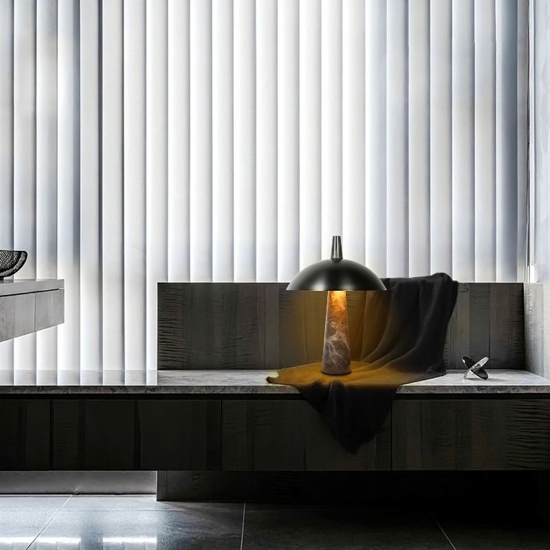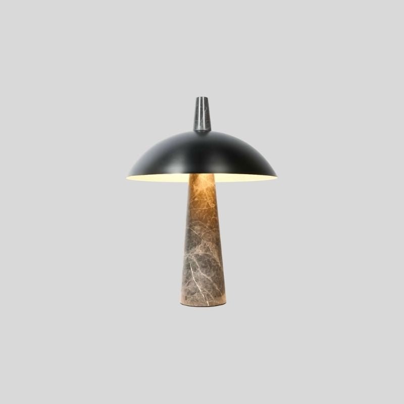 The Novexis Table Lamp is a sculptural light fixture combining a marble base with a steel dome shade. The conical stone foundation provides stability, while the curved metal shade directs warm illumination downward. Its minimalist yet striking form suits modern interiors, making it ideal for bedside tables, console surfaces, or office desks. Designed for ambient lighting, this fixture enhances spaces with its material contrast and architectural presence.
