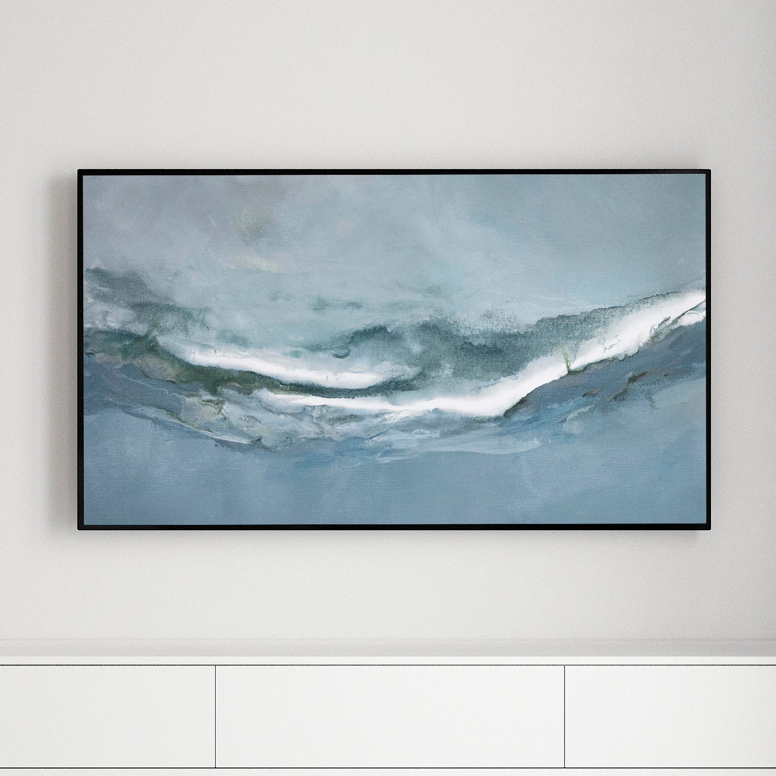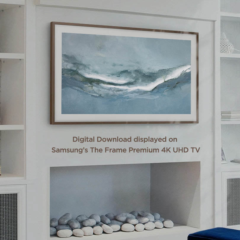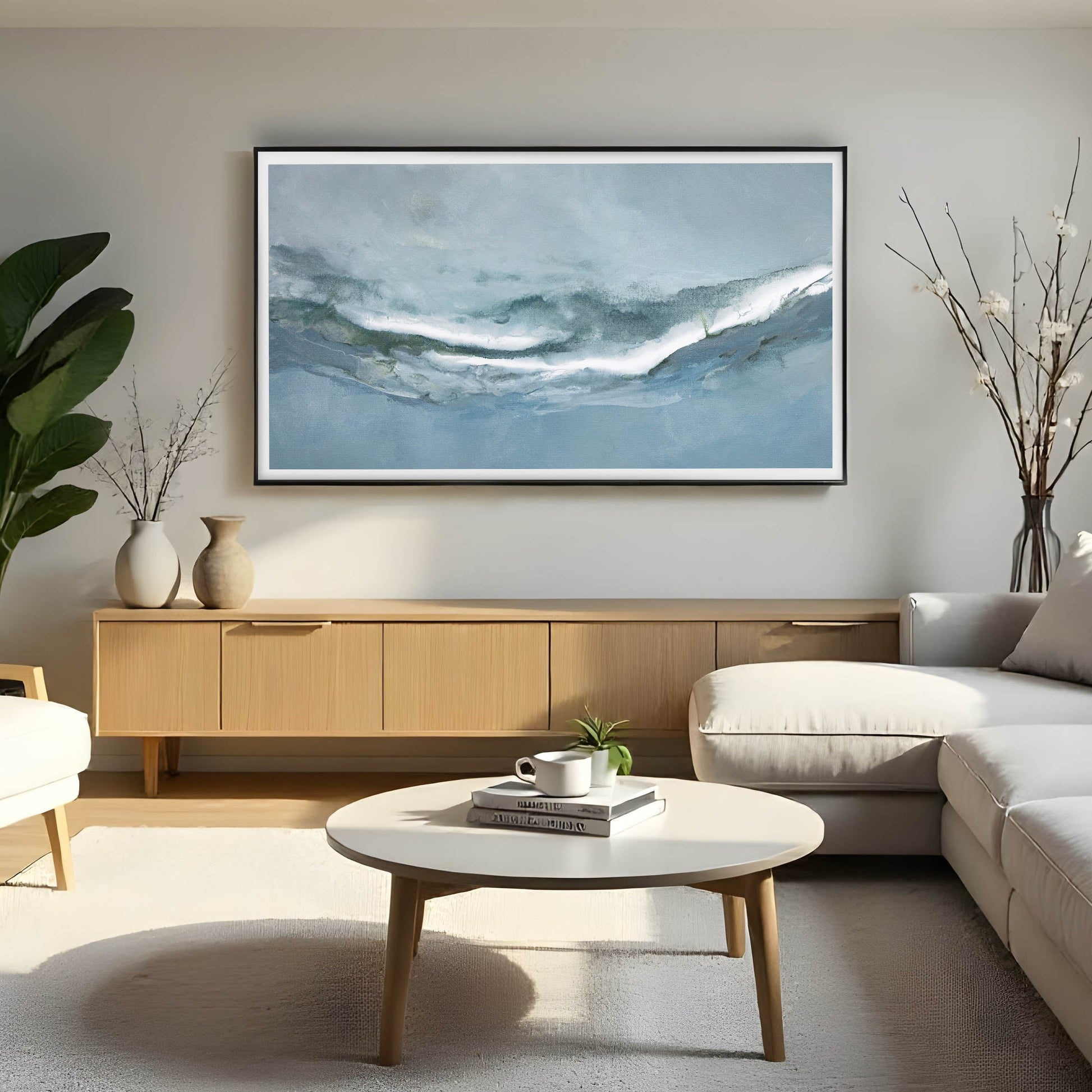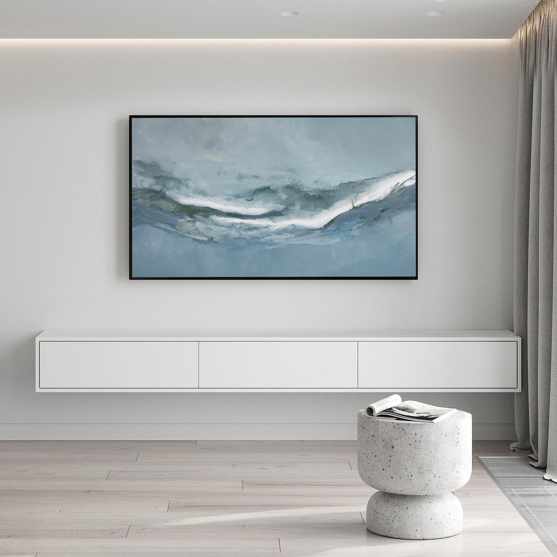 An exploration of fluid movement, this abstract coastal artwork unfolds in tones of smoky blue, muted hunter green, and soft white. Expressive, flowing brushstrokes evoke the rhythmic dance of sea and sky, blending depth with serenity. Origins speaks to the ever-changing nature of water and air, where subtle transitions and organic forms create a sense of calm and endless possibility.