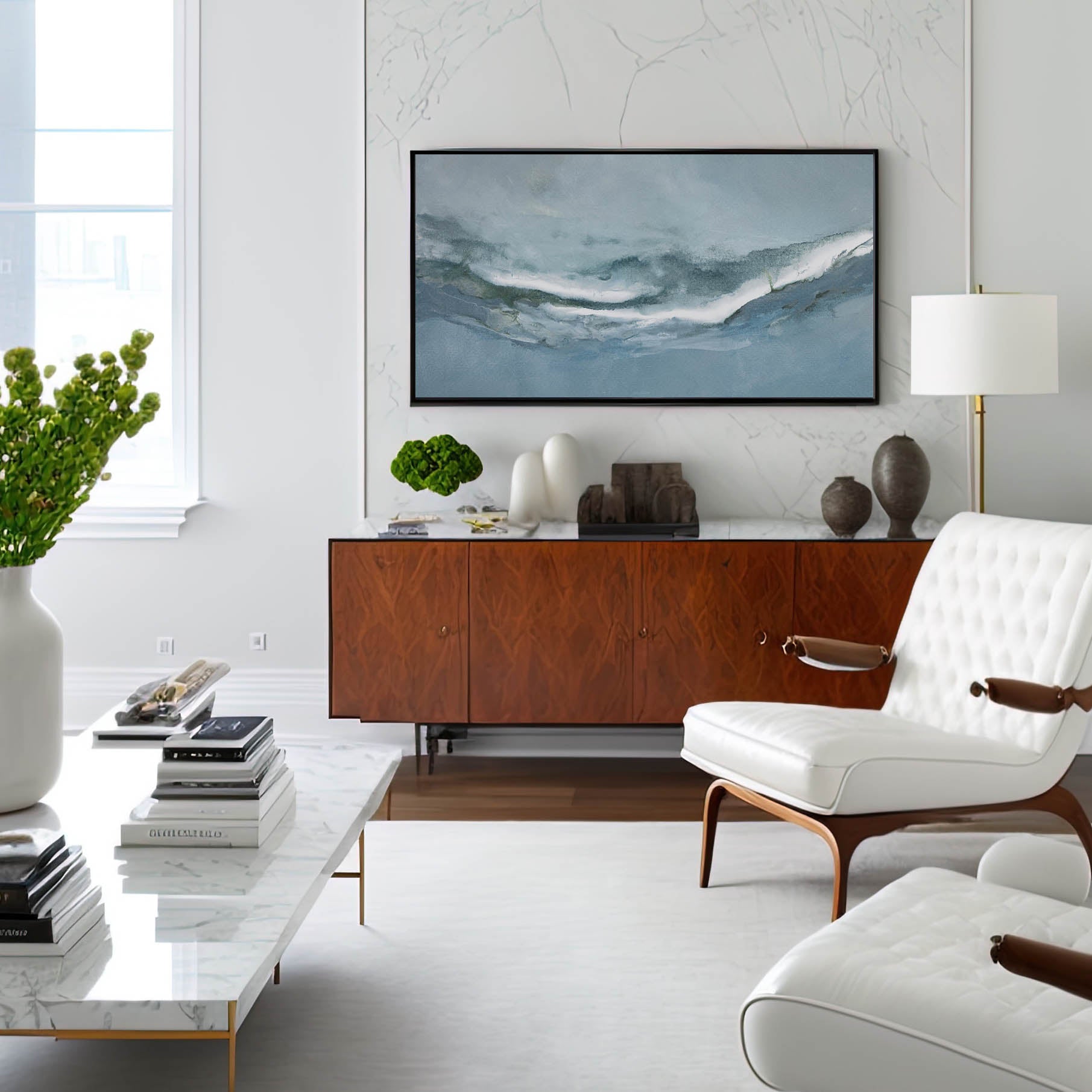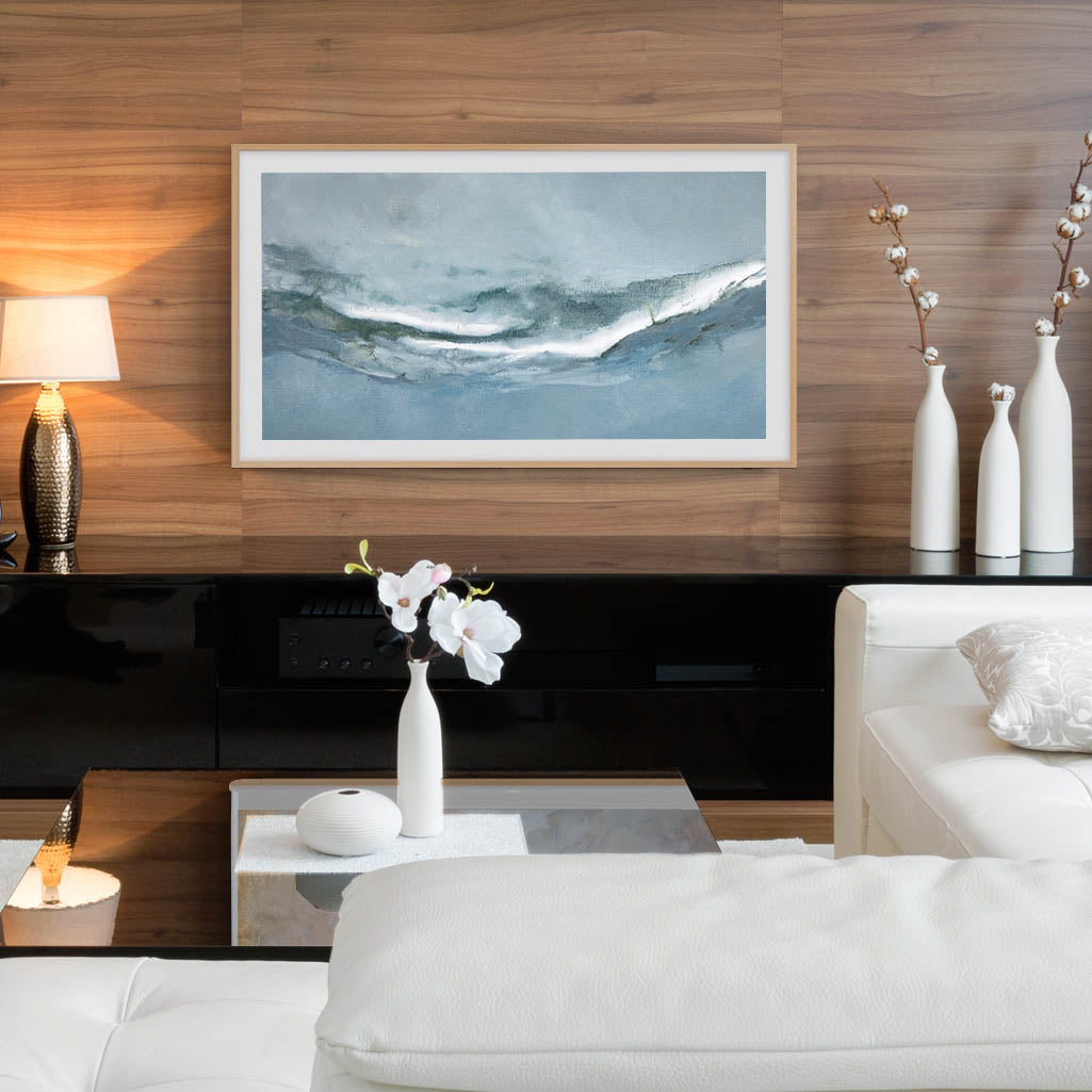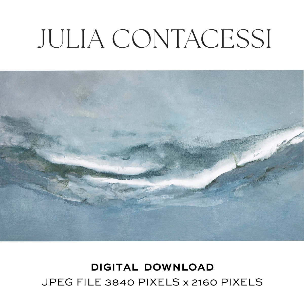 An exploration of fluid movement, this abstract coastal artwork unfolds in tones of smoky blue, muted hunter green, and soft white. Expressive, flowing brushstrokes evoke the rhythmic dance of sea and sky, blending depth with serenity. Origins speaks to the ever-changing nature of water and air, where subtle transitions and organic forms create a sense of calm and endless possibility.
