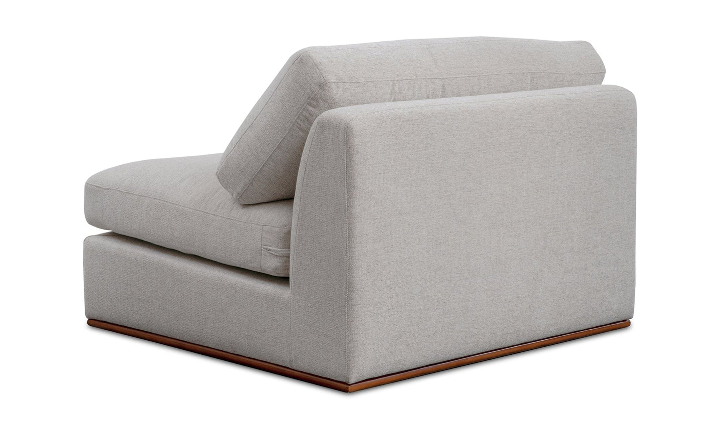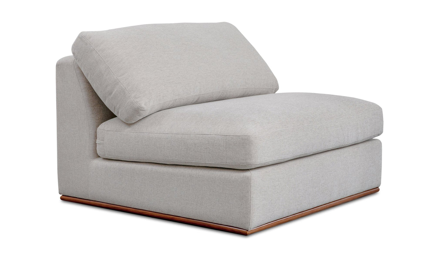 The Rue chair features a generous 70% feather-fill topper within its seat, accompanied by two toss cushions for an added layer of coziness. Its elegant silhouette is highlighted by a rubber wood base, creating a sleek floating appearance, all supported by subtle wooden legs. Designed with extreme comfort in mind, this modular chair embodies easy, neutral styling.