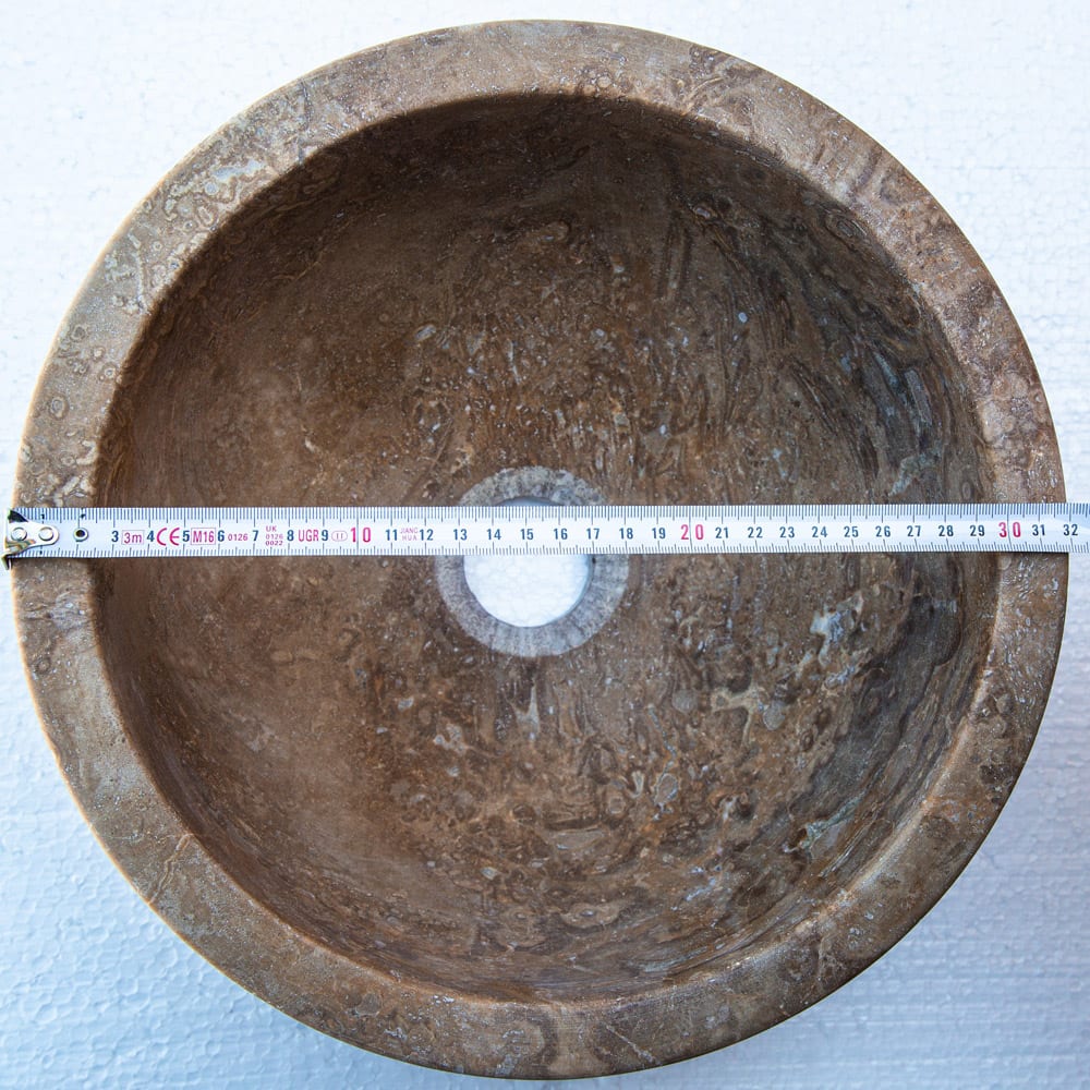 Noce Brown Travertine Natural Stone Round Above Vanity Bathroom Sink Honed and Filled (D)12.5" (H)6" is Handcrafted in Turkey and suitable for over-countertop installation.