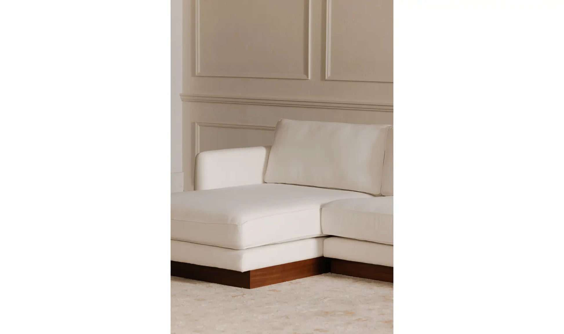 The Vernon sectional blends mid-century design with modern functionality. It features a wooden plinth base for an elevated, lighter appearance. This sectional offers unmatched comfort with removable, reversible cushions. Upholstered in durable, OEKO-TEX and Green Guard-certified fabric, it is ideal for family living, combining everyday practicality with durability.