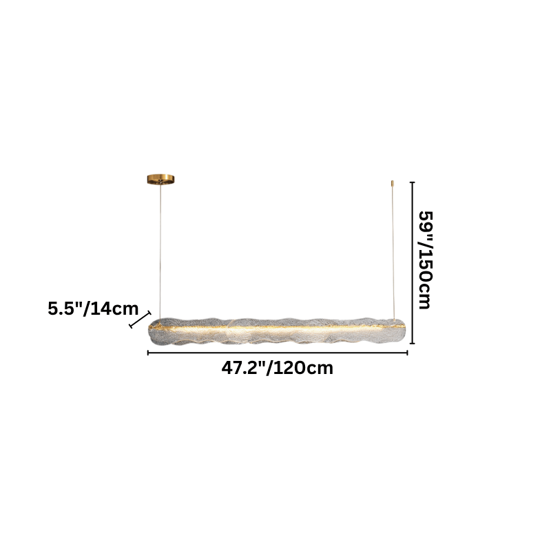 The Brivio Pendant Light is a striking light fixture crafted from premium copper and delicately textured glass, creating a sophisticated ripple-like silhouette. Its elongated, sculptural form and integrated warm lighting bring an elegant, contemporary touch to dining areas, living rooms, or modern workspaces. The fluid glass design softly diffuses light, enhancing ambient warmth while serving as a bold visual statement. Slim suspension wires give it a floating effect, emphasizing minimalism and modern luxury. This light fixture transforms any interior into a refined, artful environment.
