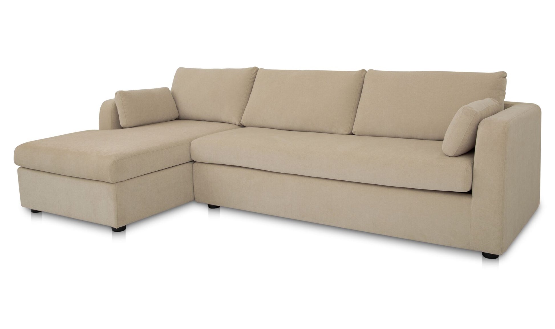 Meet the sectional that does it all. The Burrow combines streamlined design with hidden function, featuring a chaise that lifts to reveal storage and a sleeper that pulls out into a short queen mattress. Upholstered in a sand-toned recycled polyester performance blend, it’s designed for daily use with a textured hand. With softened corners and toss cushions at the arms, Burrow makes compact living feel considered and complete.
