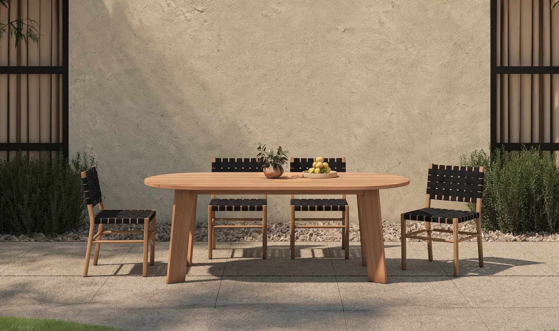 Embodying contemporary sophistication, this solid teak table celebrates natural material. The Delta outdoor dining table's angular legs provide a striking contrast to the oval, curved top, creating a minimalist yet elegant aesthetic. Over time, the table embraces a unique silver-grey patina as the teak and oils naturally weather. Though the process lends to its character, a teak sealer can be applied to maintain its original allure.
