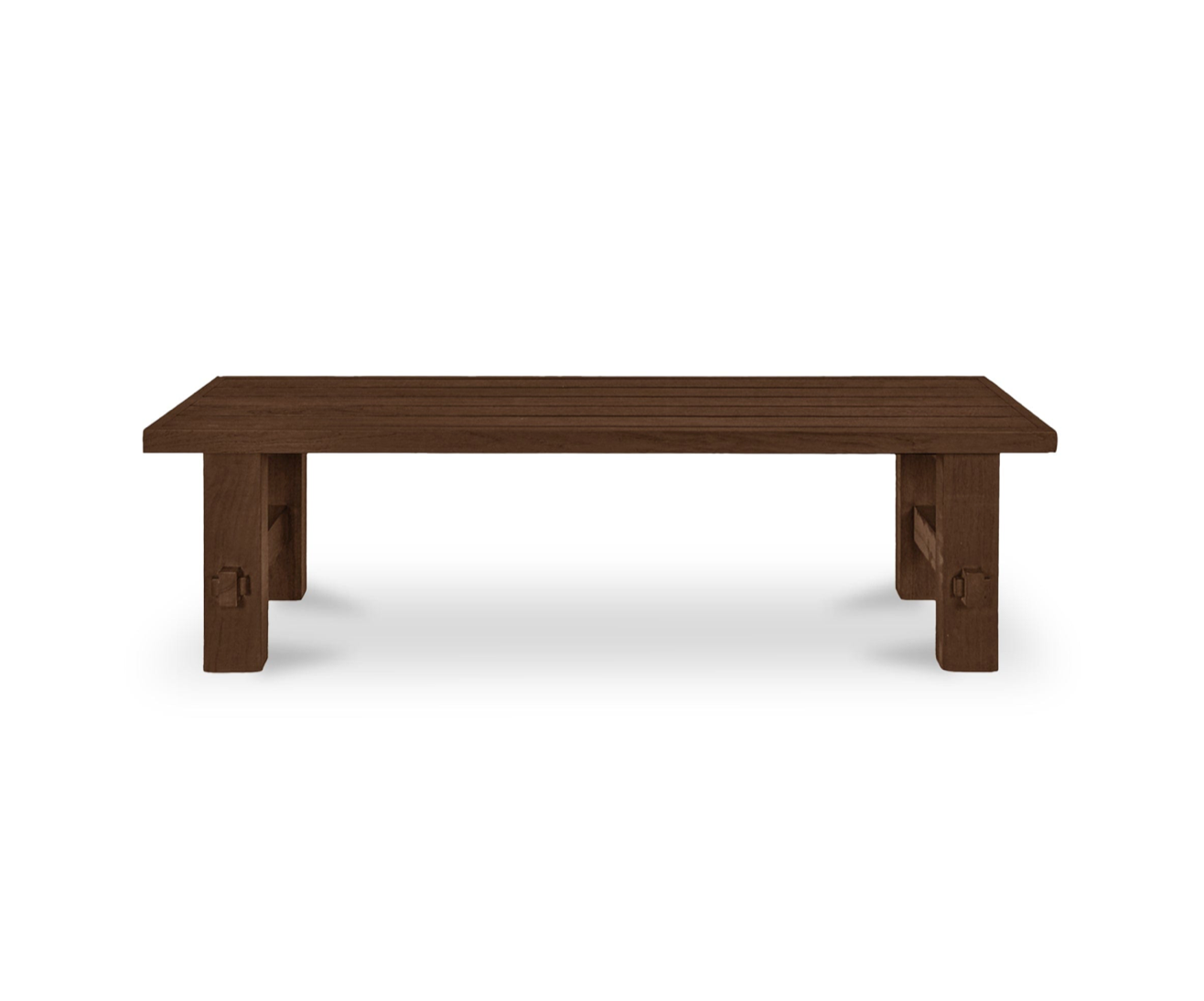The Esmond outdoor dining bench embraces traditional charm to create an outdoor sanctuary. This FSC-certified solid teak bench features a slatted top with stretchers and joinery detailing, creating a classic look with refined appeal. The brown finish adds warmth, while its durable and weather-resistant design provides comfortable seating for outdoor gatherings and everyday use.