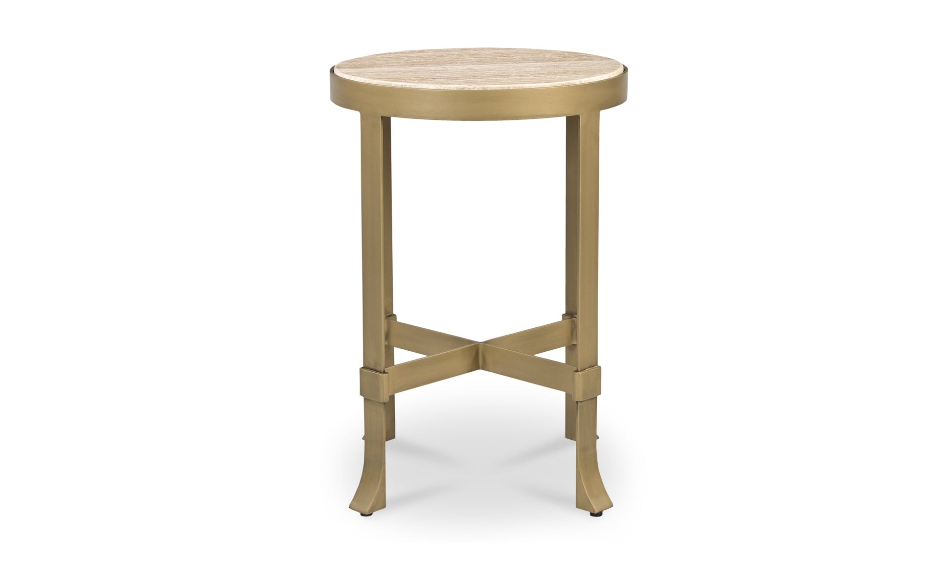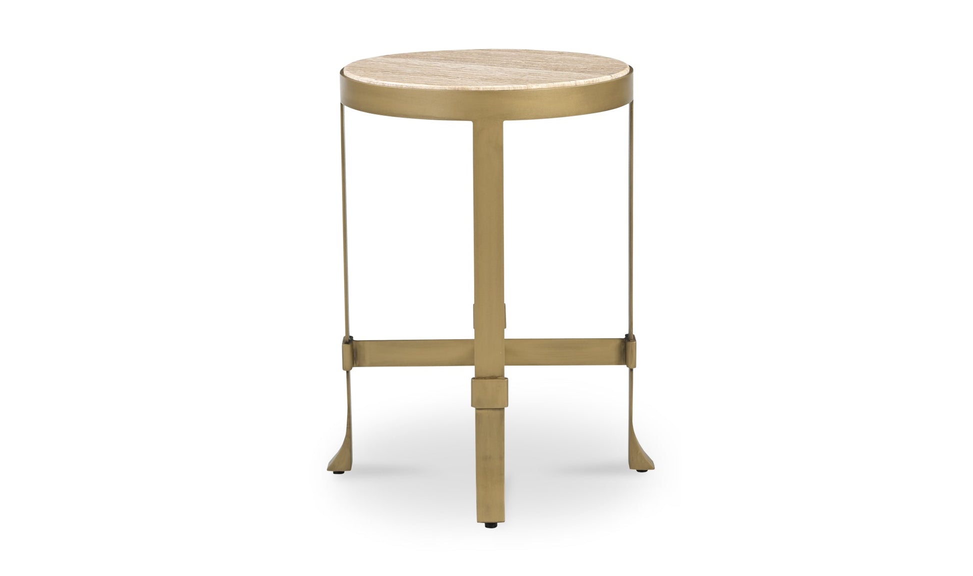 The Holli side table blends timeless white marble with sleek iron, as its expressive top rests within a subtle metal rim. The iron base, featuring gentle curves and distinctive buckle-like detail, showcases meticulous craftsmanship in classic white with bronze frame.