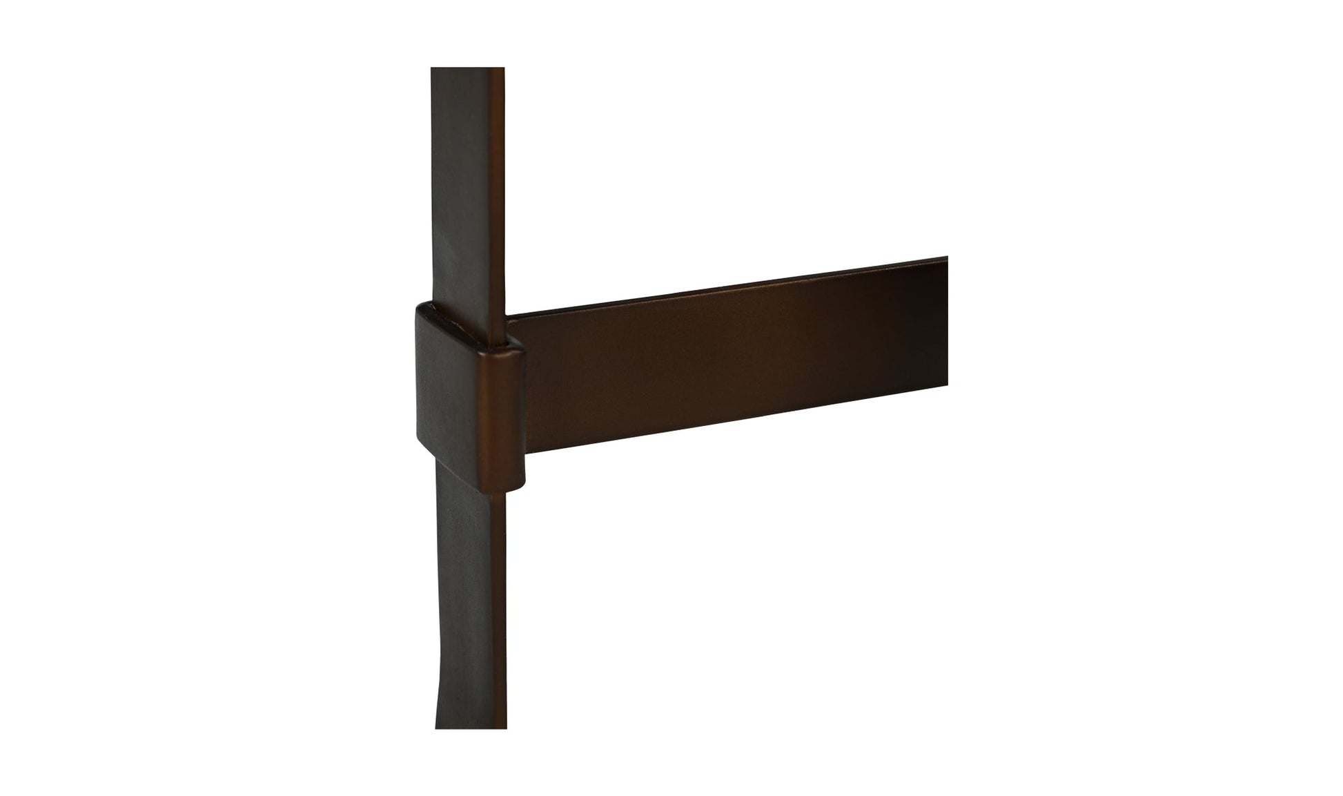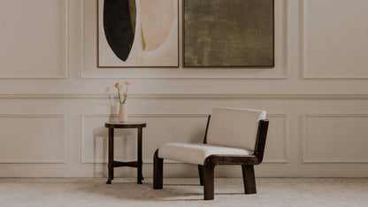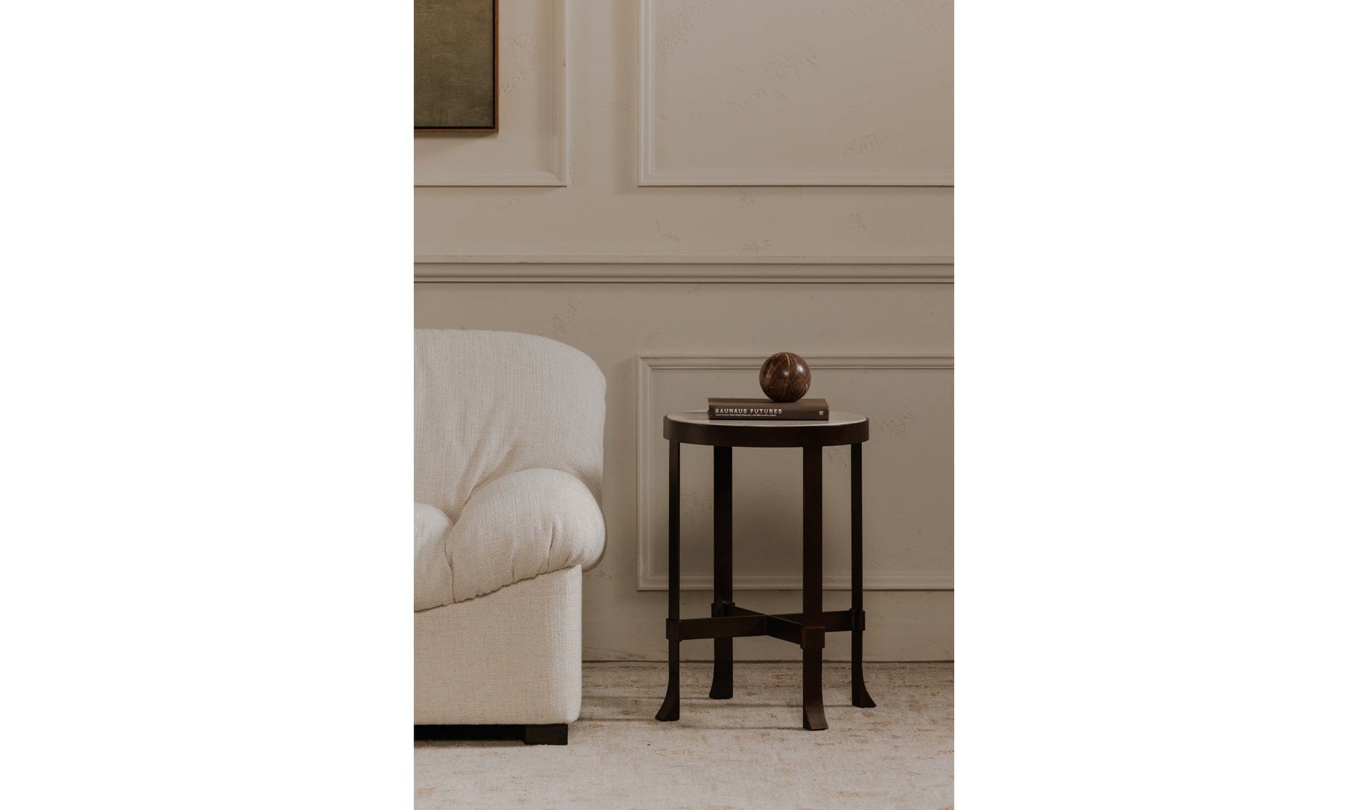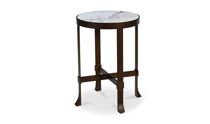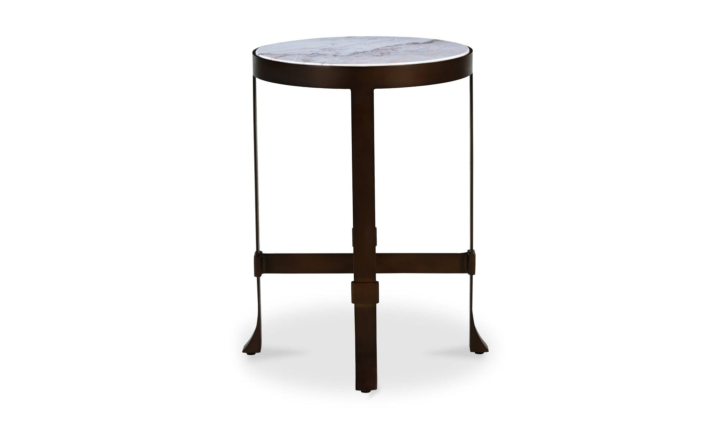 The Holli side table blends timeless white marble with sleek iron, as its expressive top rests within a subtle metal rim. The iron base, featuring gentle curves and distinctive buckle-like detail, showcases meticulous craftsmanship in classic white with bronze frame.