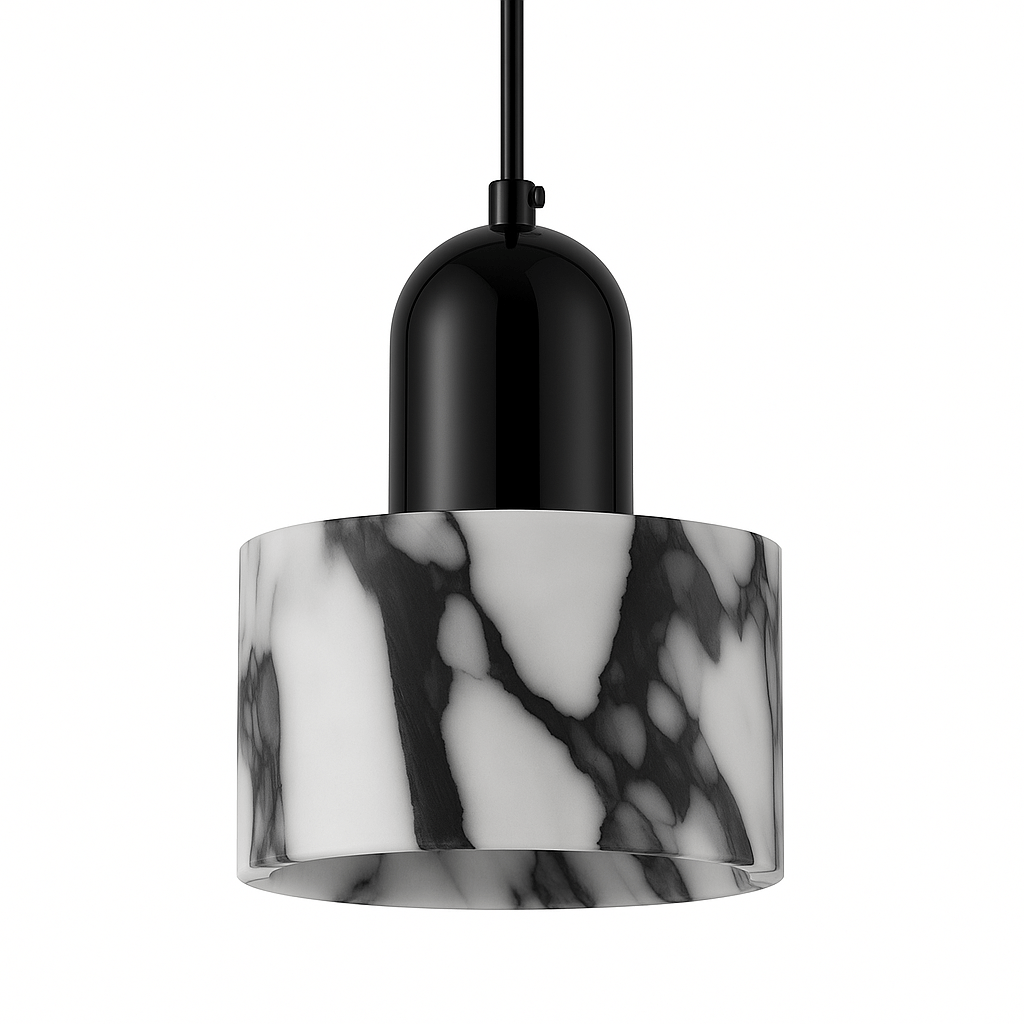 The Krevon Pendant Light features a cylindrical marble shade with organic veining, creating a striking contrast against its sleek black fixture. Designed for modern dining areas, kitchen islands, and entryways, this light fixture offers a sculptural presence while diffusing a soft, ambient glow. Available in single, double, and triple-head options, it adapts to various spatial needs. Suspended by a slim black cord, its minimalist form enhances contemporary and transitional interiors.