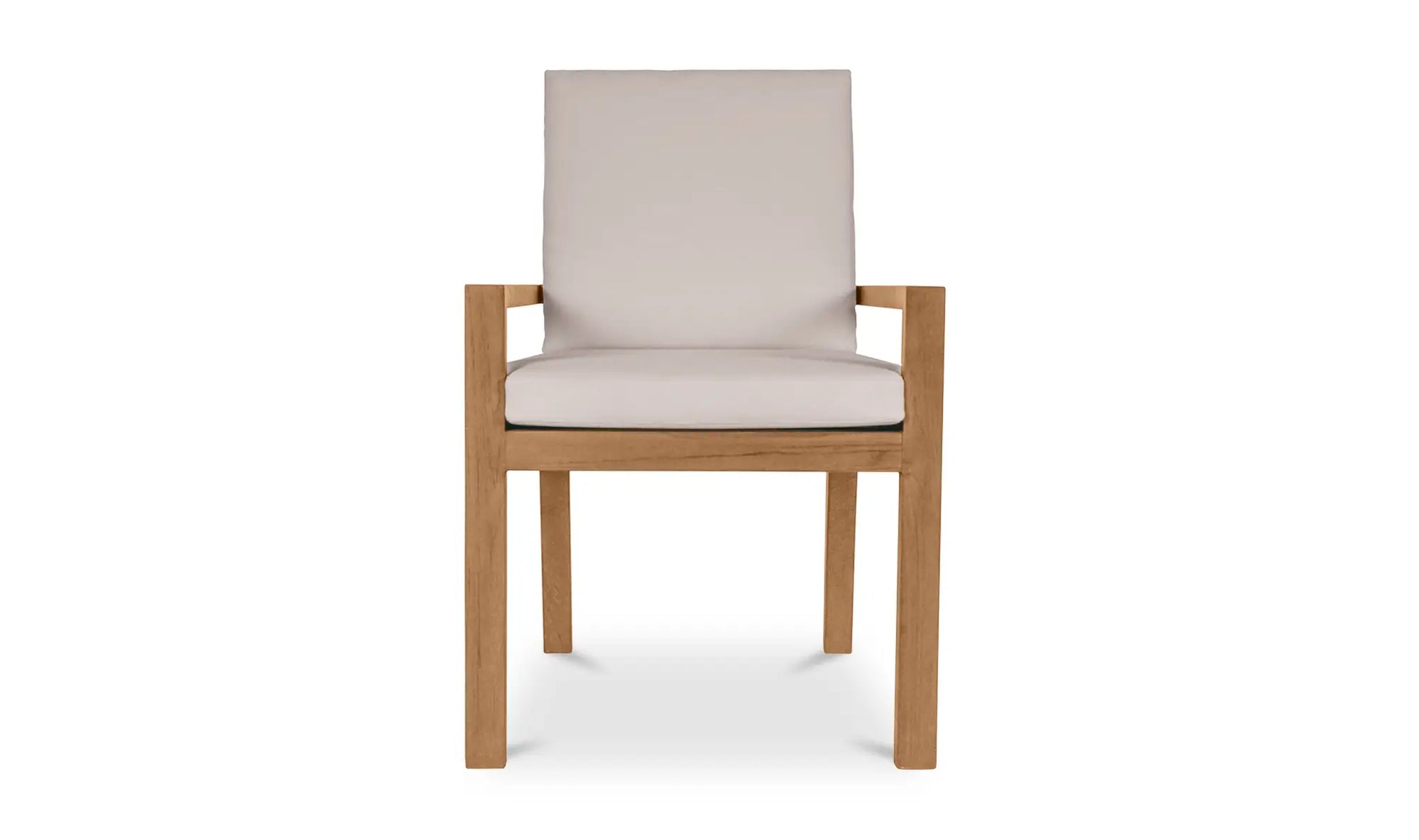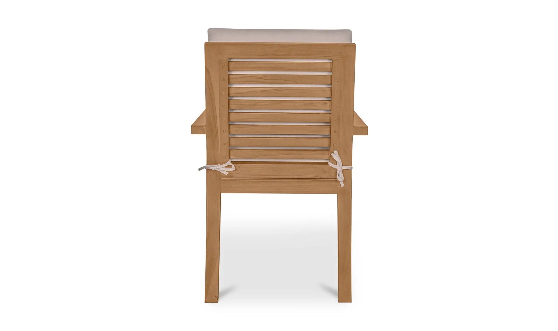 The Mateo outdoor dining chair combines comfort and understated style in the outdoor dining area. This foundational piece features a solid teak frame with quick-dry foam cushions upholstered in white 100% Olefin fabric. The slatted wood and simple frame create a timeless look, while cushion ties ensure everything stays in place, making it perfect for a sophisticated patio or garden dining set.