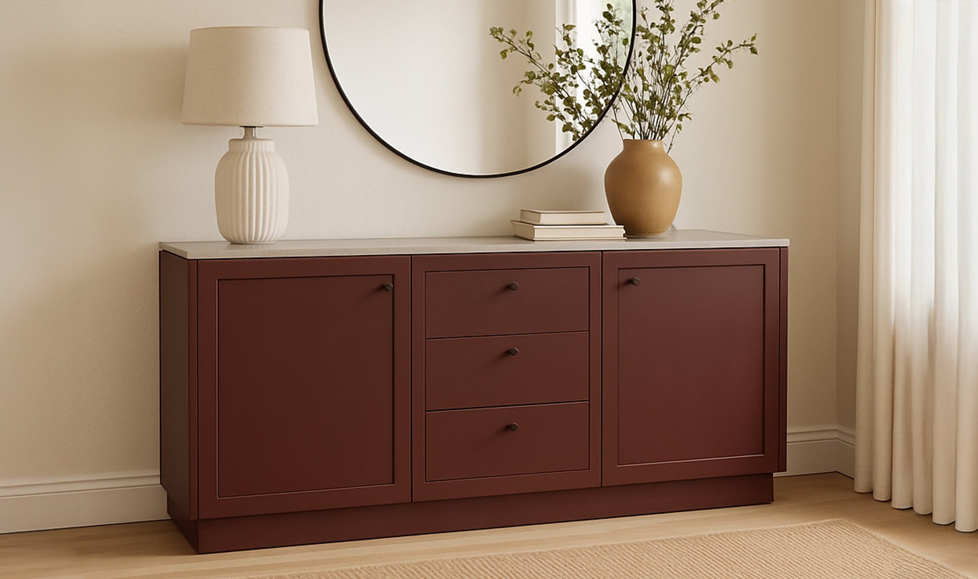 When storage lets the marble do the talking. Nadine blends smart utility with standout materials in one clean silhouette. A creamy Banswara marble top adds instant polish, paired with a color-blocked frame that brings structure and contrast. Two doors and three drawers keep the layout practical, with crisp lines and rich texture from every angle. Functional where it counts. Refined where it shows.