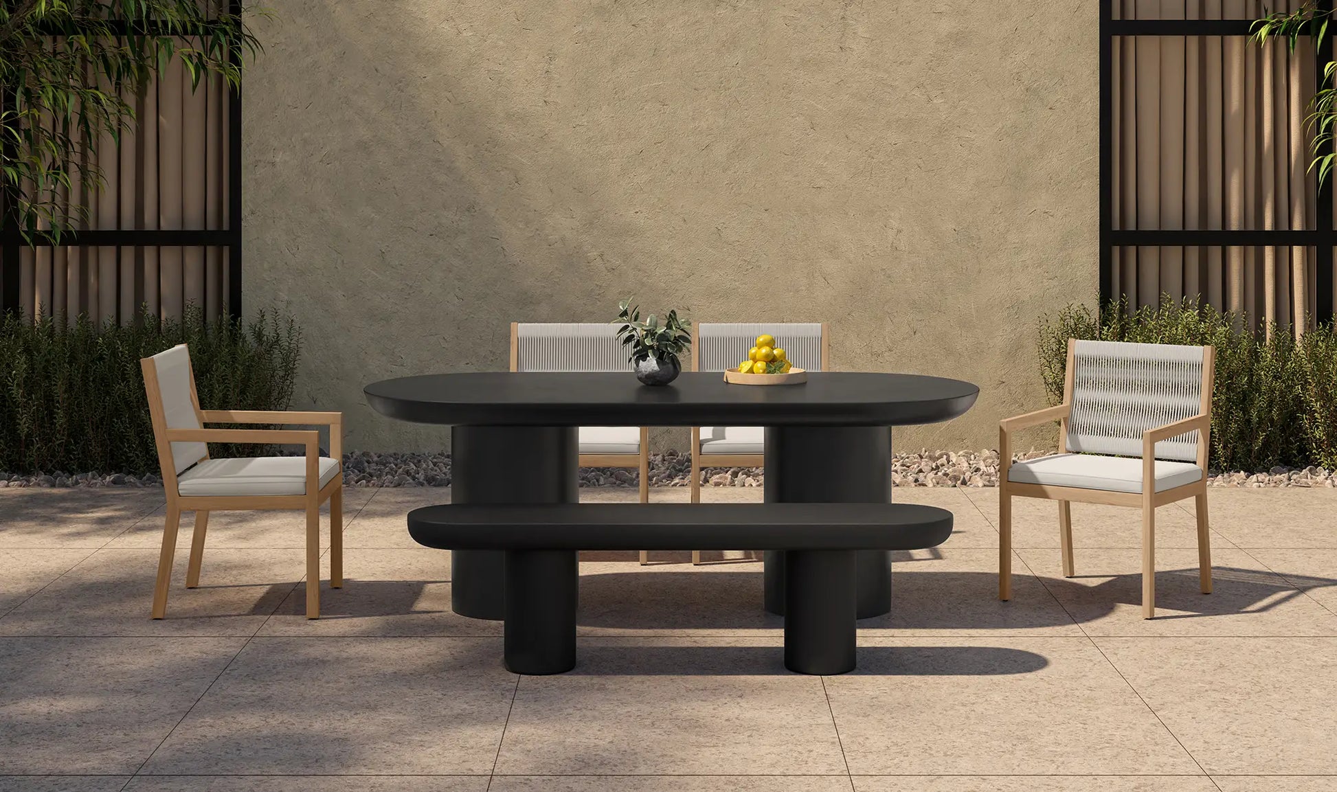 Stone simplicity meets dreamy darkness. Made from fiber-reinforced natural concrete with a jet black finish and set in a sturdy iron frame, the Rocca indoor/outdoor collection's elemental design places material and forms center stage. Featuring a monolithic contemporary look, this 6-seater dining table's twin pillars and slab tabletop serve for both drama and comfort. Perfect for pairing with plants and accent pieces, combine this table with other pieces from the Rocca collection for the full effect. Please read through the care instructions below to fully enjoy the beauty of this collection for years to come.