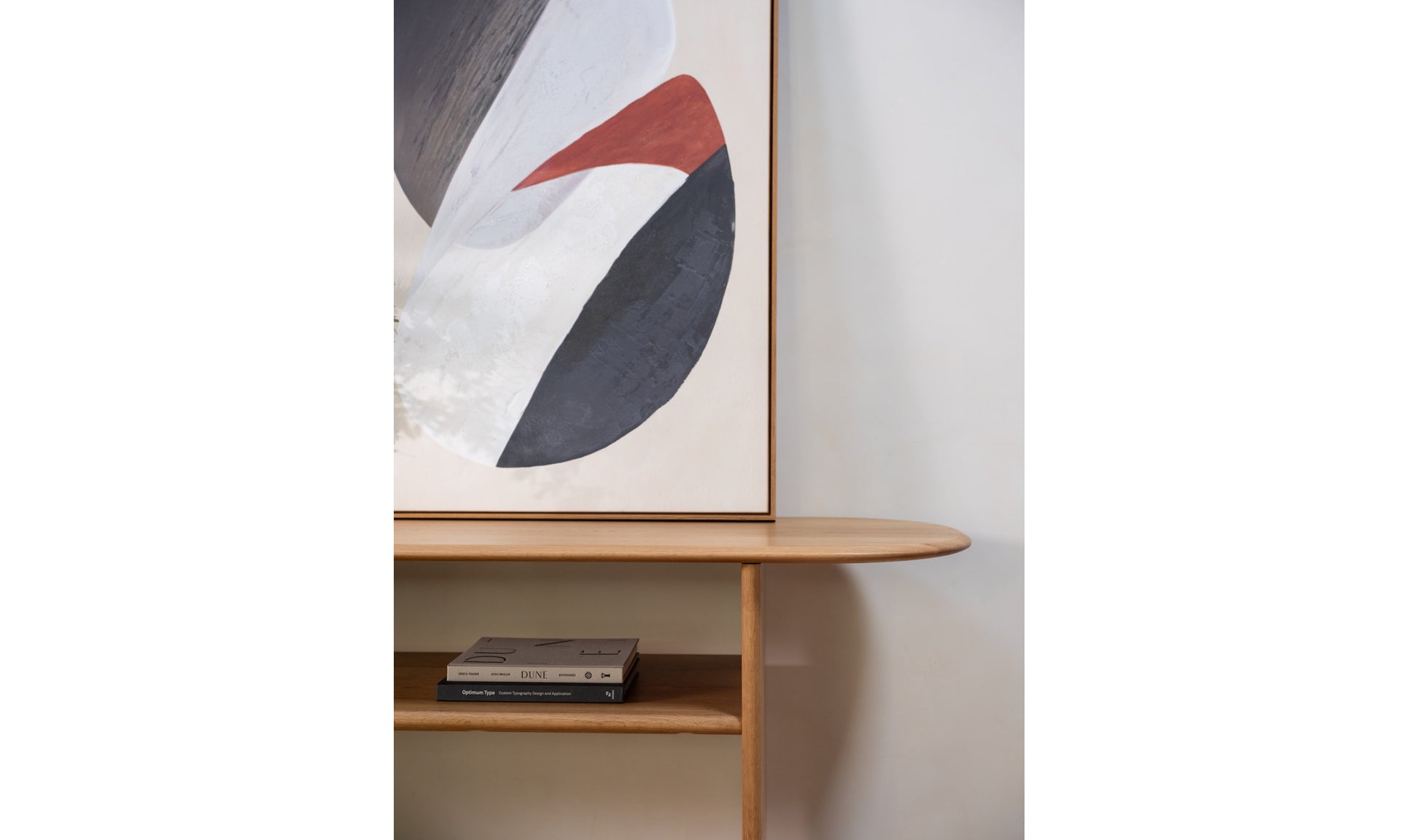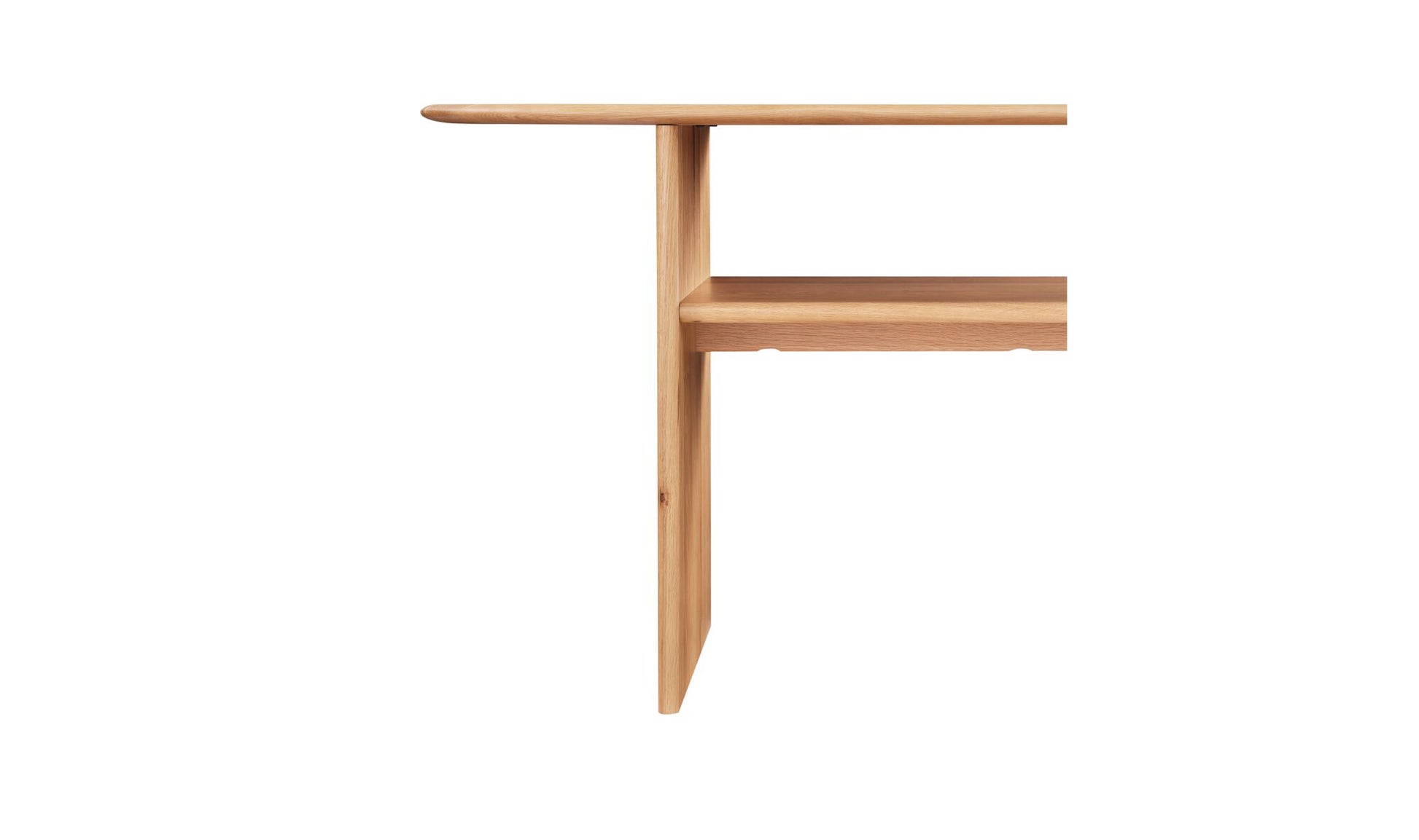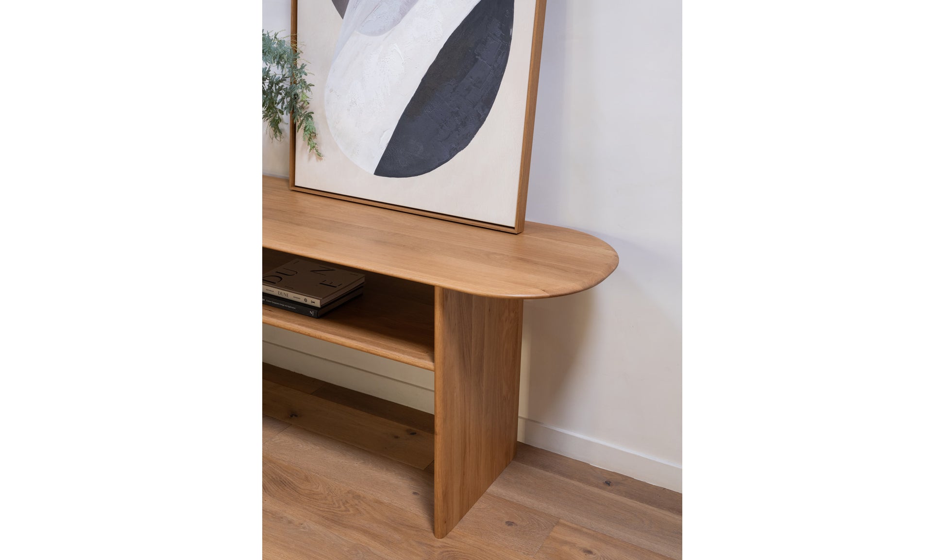 Capsule curves with everyday ease? Yes, please. Ruby keeps things soft, simple, and totally pulled together. Its capsule-shaped solid oak top adds just the right curve to your space, while the open shelf brings easy storage to wherever it lands—entryway, hallway, behind the sofa. The rounded edges make it family-friendly; the minimal shape makes it timeless. It’s a backdrop piece that gets the assignment: subtle, useful, and secretly a showoff.