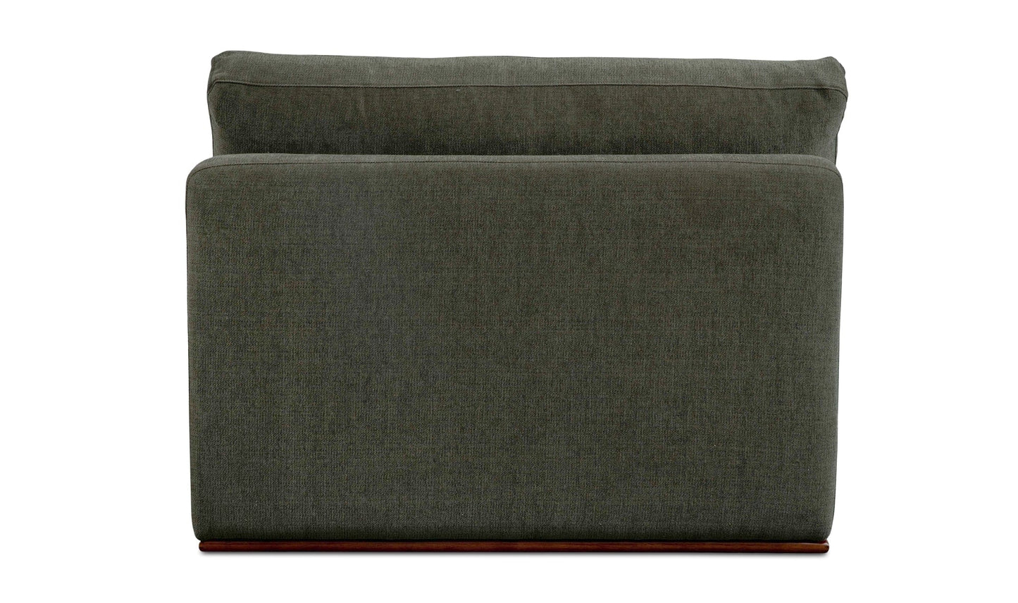 The Rue chair features a generous 70% feather-fill topper within its seat, accompanied by two toss cushions for an added layer of coziness. Its elegant silhouette is highlighted by a rubber wood base, creating a sleek floating appearance, all supported by subtle wooden legs. Designed with extreme comfort in mind, this modular chair embodies easy, neutral styling.