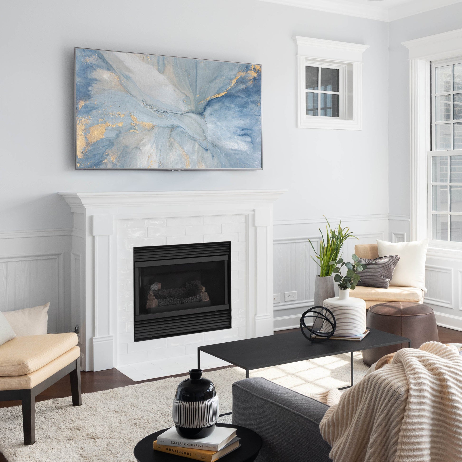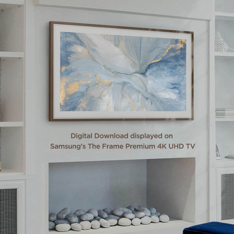The fluid cascade of soft blue, gold and neutral tones carry you around every inch of this abstract painting.