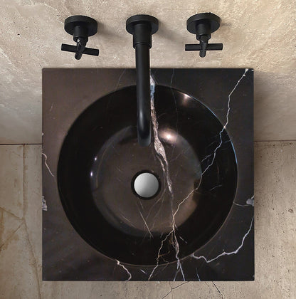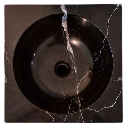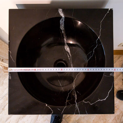 Produced from 3 solid marble pieces (Base, Column and Sink on the top) Base and Sink pieces are produced from Toros Black Marble with glossy polished finish. Column is produced from Carrara White marble with rough/combed finish. Hand carved natural marble construction. Length 16 inches (=400mm) Width 16 inches (=400mm) Total Height: 36 inches (=900mm) Drain hole 1.5 inches. Its curved edges and smooth construction facilitate the cleaning and maintenance of this sink bowl. Not easy to produce cracks, refused to dirt deposition, durable and not deformed. No overflow and very resistant to drains. Smooth and polished surface, very resistant to stains and can be easily maintained.