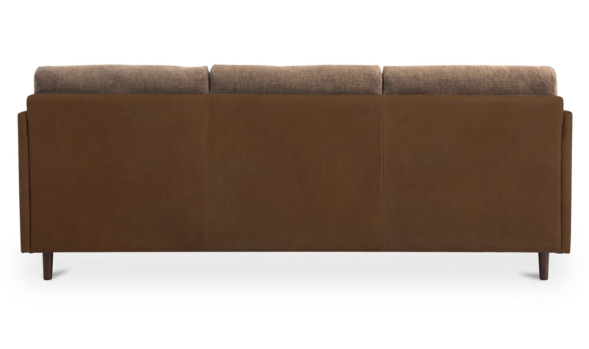A little retro, a lot modern. The Teller Sofa mixes flecked polyester upholstery with top grain leather wrapping the arms and back for tonal brown contrast. Foam, fiber, and faux feather fill cushions keep the sit plush yet supportive, while slim rubberwood legs lift the frame with mid-century ease. Teller turns mixed materials into its signature style statement.