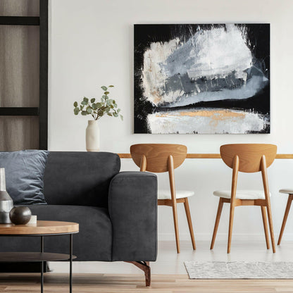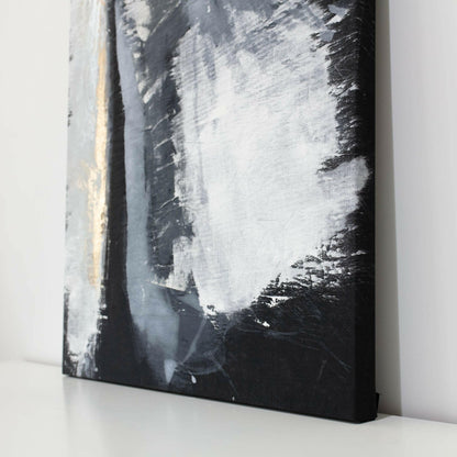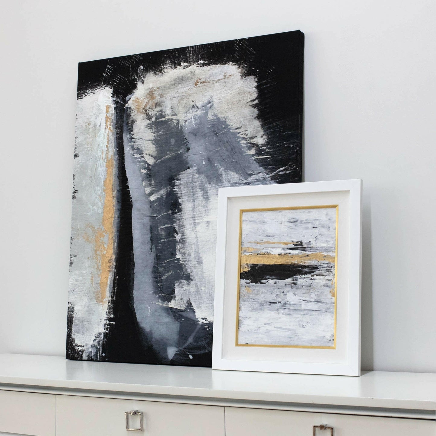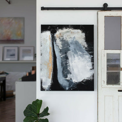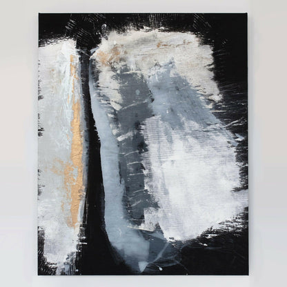 Washes of acrylic paint layer atop black linen to mark time and movement. This gallery wrapped canvas has paint marks that carry over to the sides. It comes wired and ready to hang. Signed on the back.