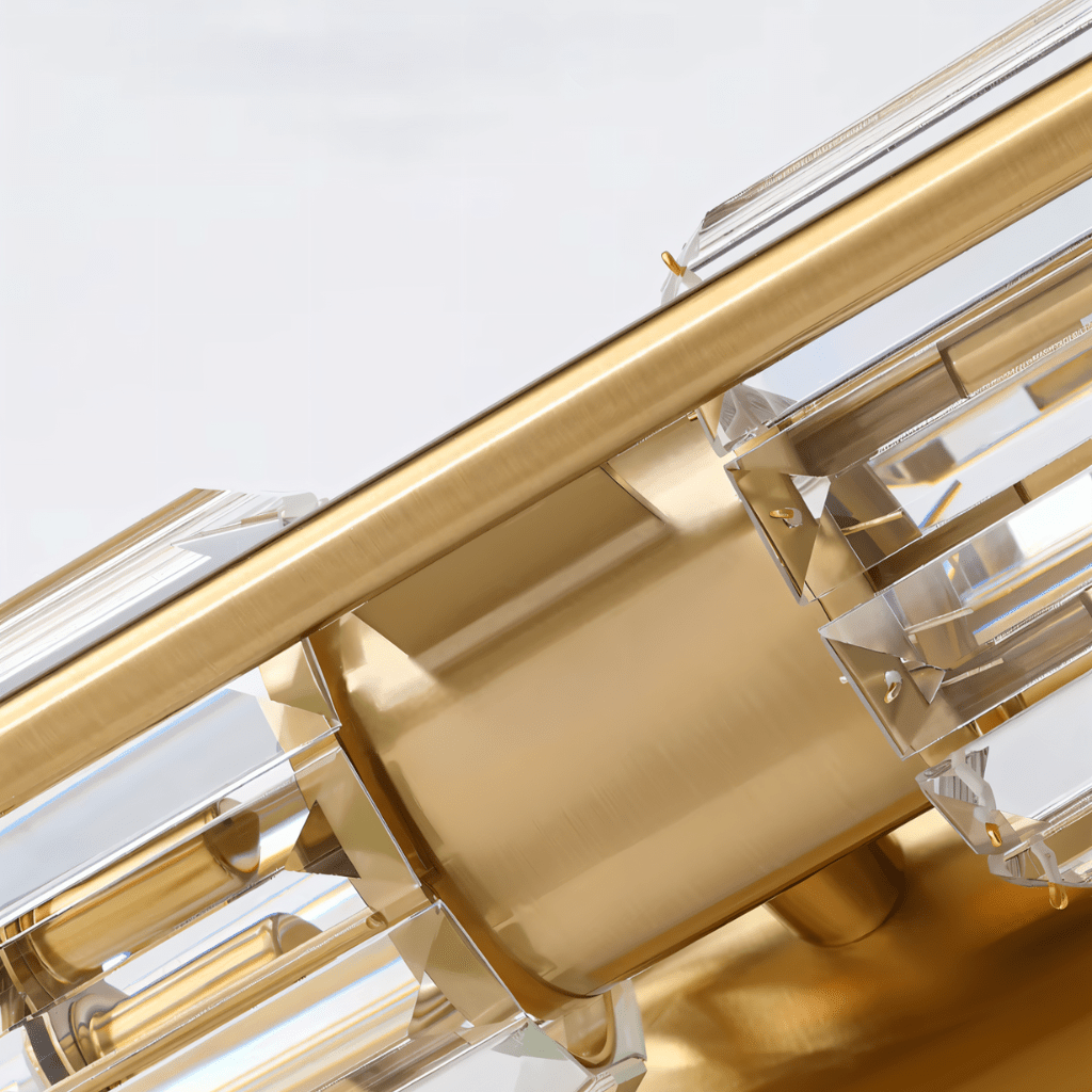 The Vexa Wall Lamp is a copper and crystal light fixture featuring dual vertical crystal cylinders with a central copper structure that enhances both strength and elegance. Its design refracts light through the crystal surfaces, casting layered reflections that add depth and texture to walls. Ideal for hallways, bedrooms, living rooms, or beside mirrors, it combines modern symmetry with a luxurious glow to elevate any interior.