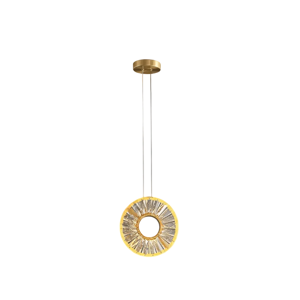 Zunel Pendant Light is a refined light fixture crafted from premium copper and a crystal lamp shade. Its circular halo design features precision-cut crystal segments radiating around a hollow center, delivering both ambient and focal illumination. Suspended elegantly with dual cables, it suits high-ceiling areas such as dining spaces, foyers, or contemporary lounges. The crystal elements refract light with brilliance, enhancing the room’s visual depth. This fixture merges modern minimalism with luxury detailing for a bold yet graceful lighting statement.